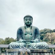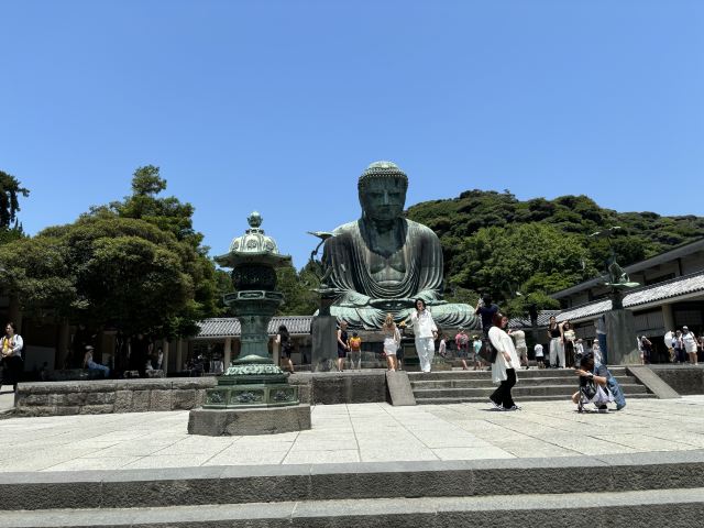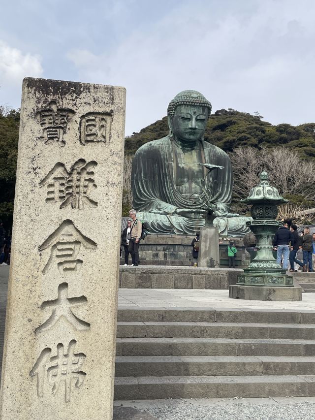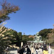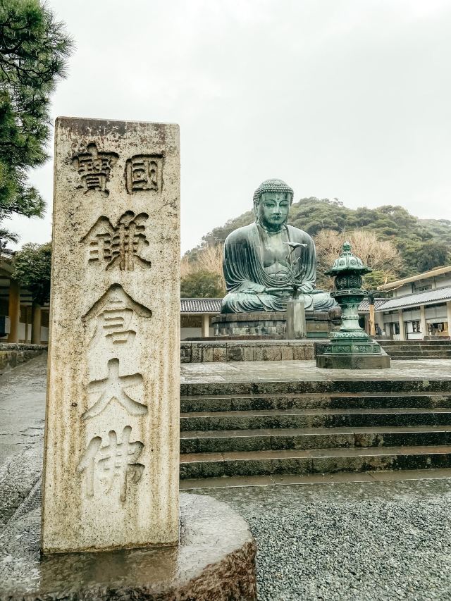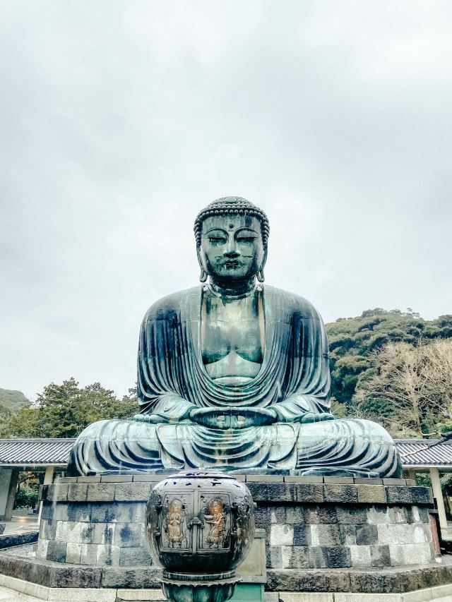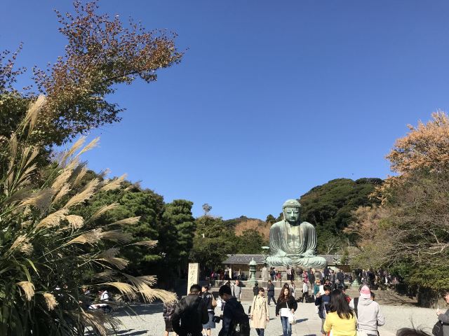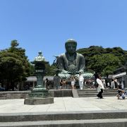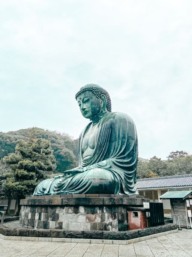 由南面的仁王门进入镰仓大佛,然后在手水舍洗个手,再步入中央的院落,映入眼帘的便是巨大的镰仓大佛了。这座阿弥陀如来佛端坐在高台上,其面相和姿势都具有镰仓时代流行的中国宋代佛像风格。若是在樱花季到此,蓝天白云之下的镰仓大佛更别有一番韵味。