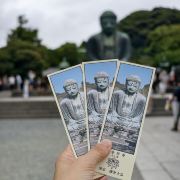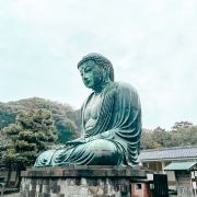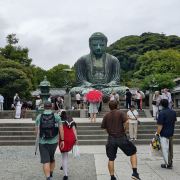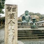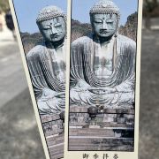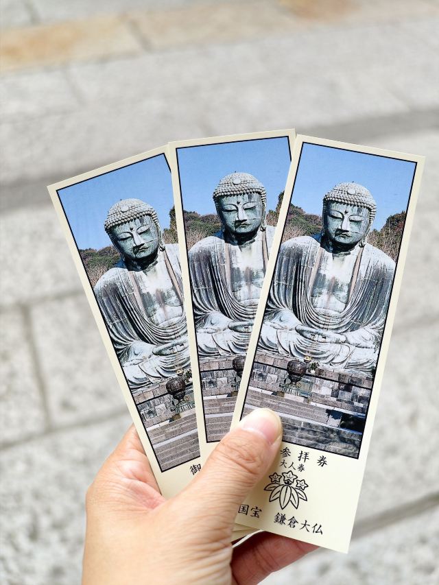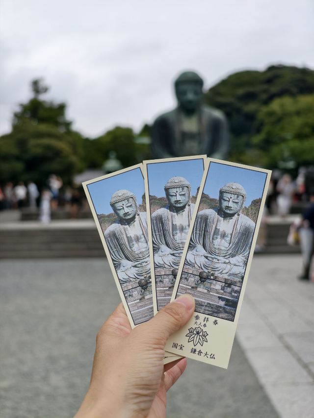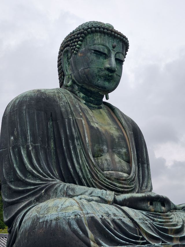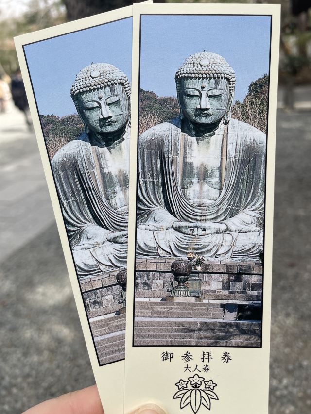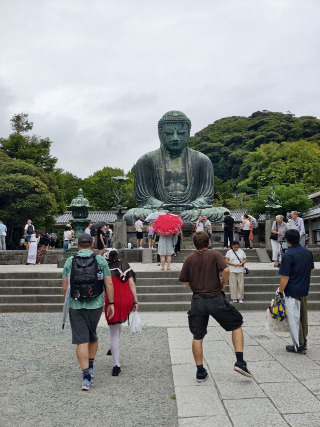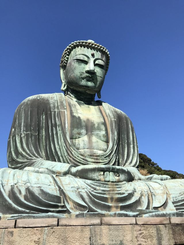 由南面的仁王门进入镰仓大佛,然后在手水舍洗个手,再步入中央的院落,映入眼帘的便是巨大的镰仓大佛了。这座阿弥陀如来佛端坐在高台上,其面相和姿势都具有镰仓时代流行的中国宋代佛像风格。若是在樱花季到此,蓝天白云之下的镰仓大佛更别有一番韵味。