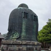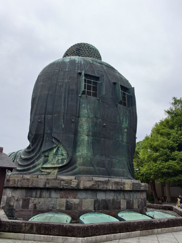 镰仓大佛开始是木制的,因暴风雨袭击倒塌,后来重新以青铜铸造,据说当时其全身还涂满了金箔,并供奉在大佛殿中。由于室町时代的一次海啸吞噬了大佛殿,从此镰仓大佛便单独坐落在露天台座上了。 在以大佛为中心的回廊周围可以看到一些与镰仓大佛相关的各种石碑,其中有一块歌碑上还刻着“释迦牟尼是美男”的句子。在面向大佛右侧的回廊内部,悬挂着一双约1米长的大草鞋,据说是茨城县的孩童们编织献给大佛的供物。 继续向后山走去,可以从高处以不同角度俯拍大佛,那里还有一座供奉着观音菩萨的观月堂。