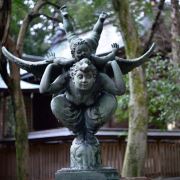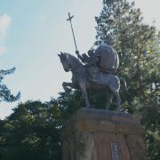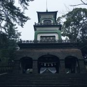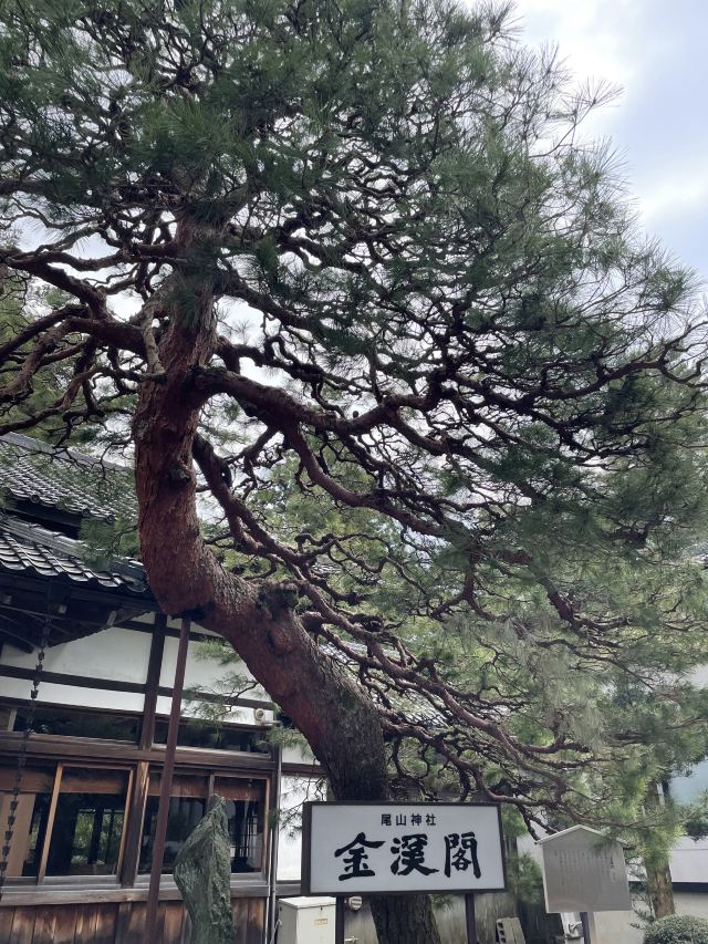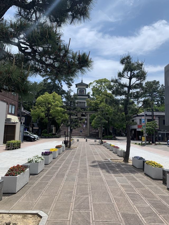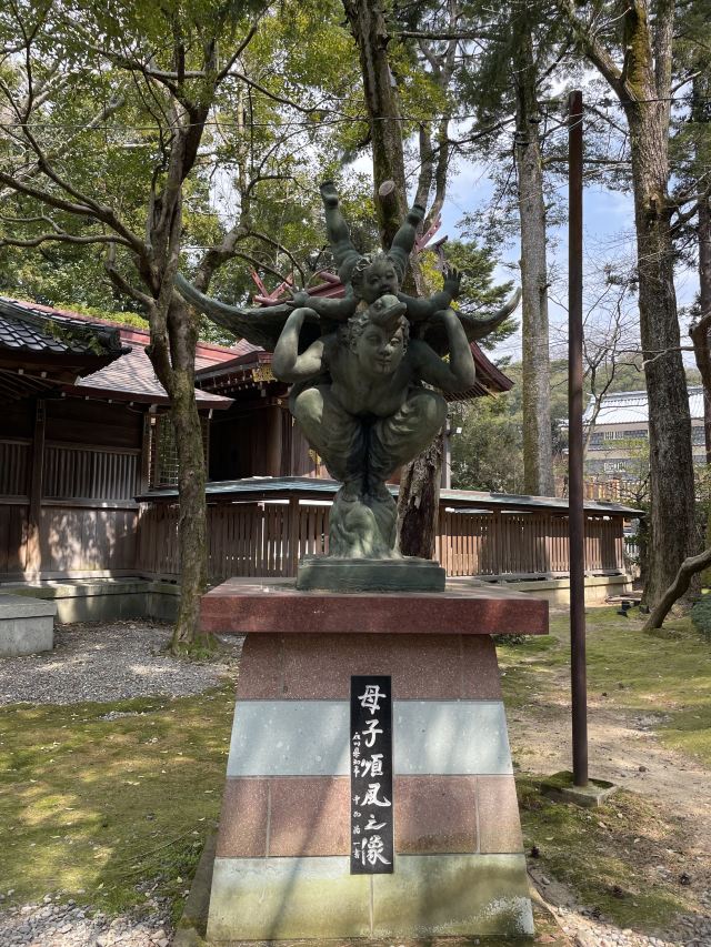 祭祀前田利家的尾山神社在1873年迁移此地,正面的神门是融合和洋中风格的三层楼门,由于是1875年建成的古迹,现在被指定为国家的重要文化财产。取琵琶等的古乐器为形的假岛以及配上桥的池泉回游式庭园,都是值得一游的景点。此外,在神社境内还放有前田利家与妻子的人像。