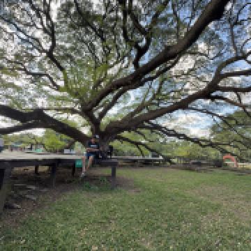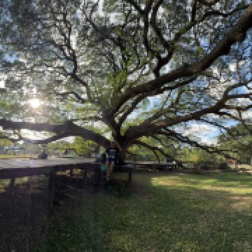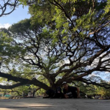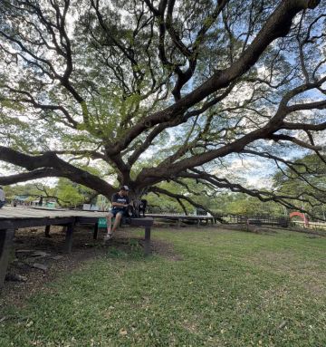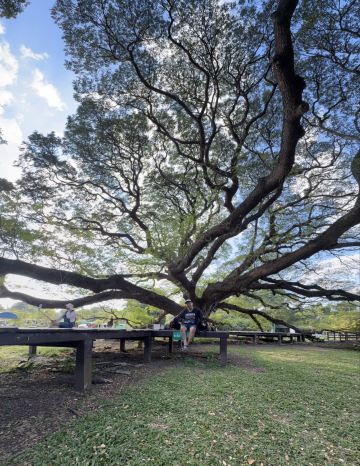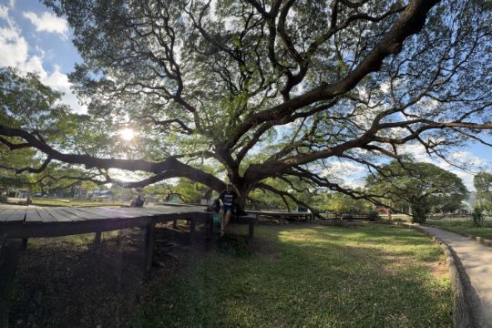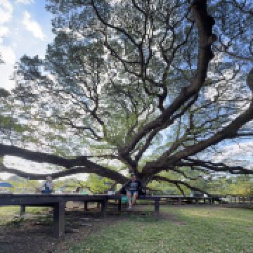 这棵巨大的雨树是泰国较古老的树之一,据说已经有三百多年的历史了,树下有草地、花园和小溪等景观,环境清幽。