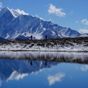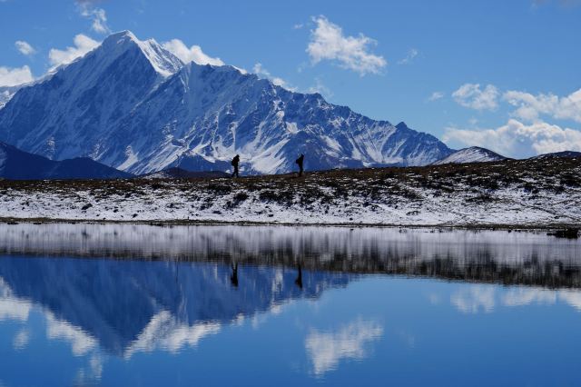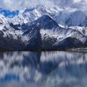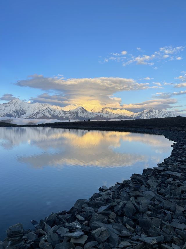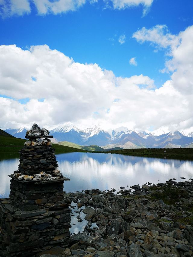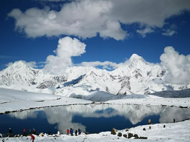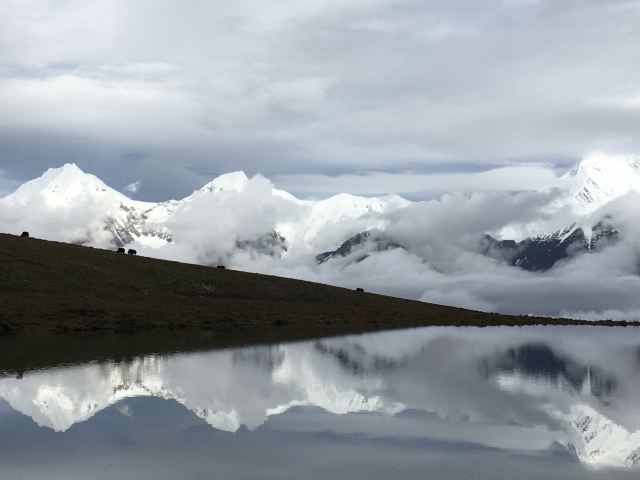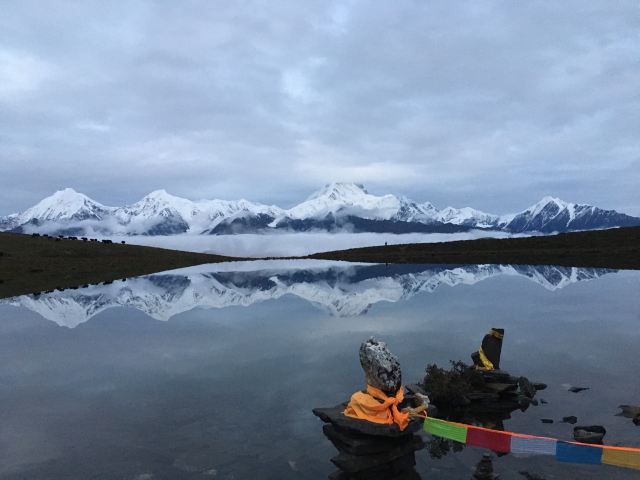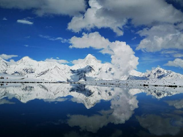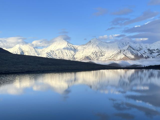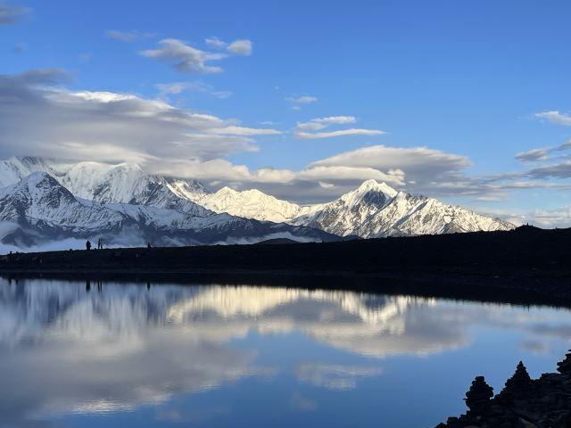 冷嘎措被称为贡嘎雪山的“梳妆镜”,蓝天白云下,贡嘎群峰在海子中的倒影非常漂亮,尤其是日出日落时分,被云层遮挡的山峰在阳光的照耀下显得异常神秘,似乎就是天宫中的圣域,十分威严。