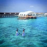 卡尼岛的水上活动也是无比丰富。除了常见的浮潜、深潜,还可以参加独木舟、立式划水板(SUP)等活动。特别是立式划水板,站在板上滑行在平静的海面上,四周只有海与天,这种宁静和美丽的景色,让人无法忘怀。此外,许多高级度假村也提供私人船游服务,可以租用私人快艇进行日落巡航,或是出海远足,寻找海豚和鲸鱼。这些活动让我感受到马尔代夫海域的无
