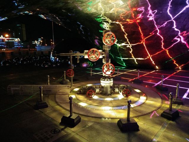 站在大油泡地下,可以看到她的四个支撑点和四个出口,还有一个比较专业的石油仪器表。