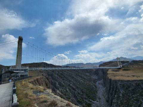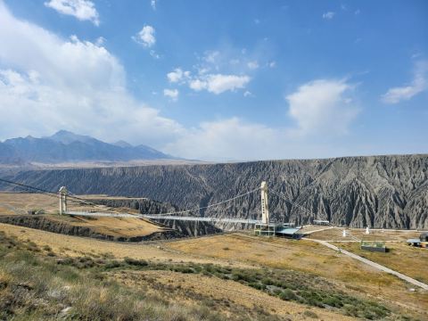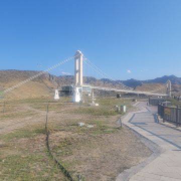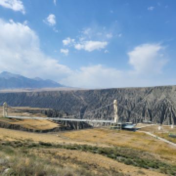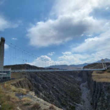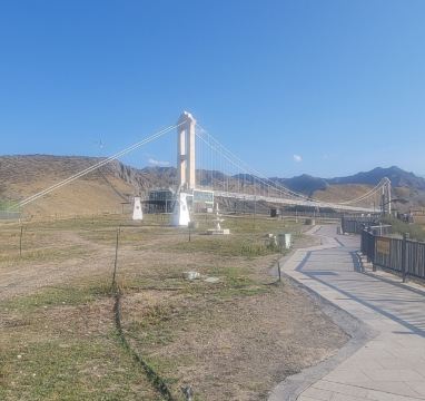 独库大玻璃桥桥梁结构形式为单跨186米长的柔性悬索桥,设计灵感来源于天山雪莲,是大峡谷的佳拍摄点,桥面净宽3米,离地大高度200米,桥中央有莲花造型观景平台,其中包括3D冰山图案和9D玻璃碎裂效果及虚幻引擎雷达互动游戏。