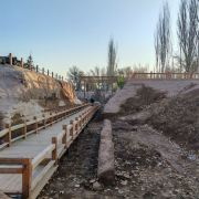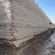 盘橐城位于喀什市东南郊的吐曼河岸边,又叫作“艾斯克萨”城,本世纪初,法国人伯希合希合曾到此实地勘测,据其所绘图纸标示,此城当时沿存北面和西面两段土筑城墙,北墙长287米,醒墙长205米,墙基厚约7米。城的平面近似一梯形,占地总面积近20亩。现今,遗址大部分为工厂单位占用,仅有一段长约8米,高近3米的旧城残垣遗留下来。