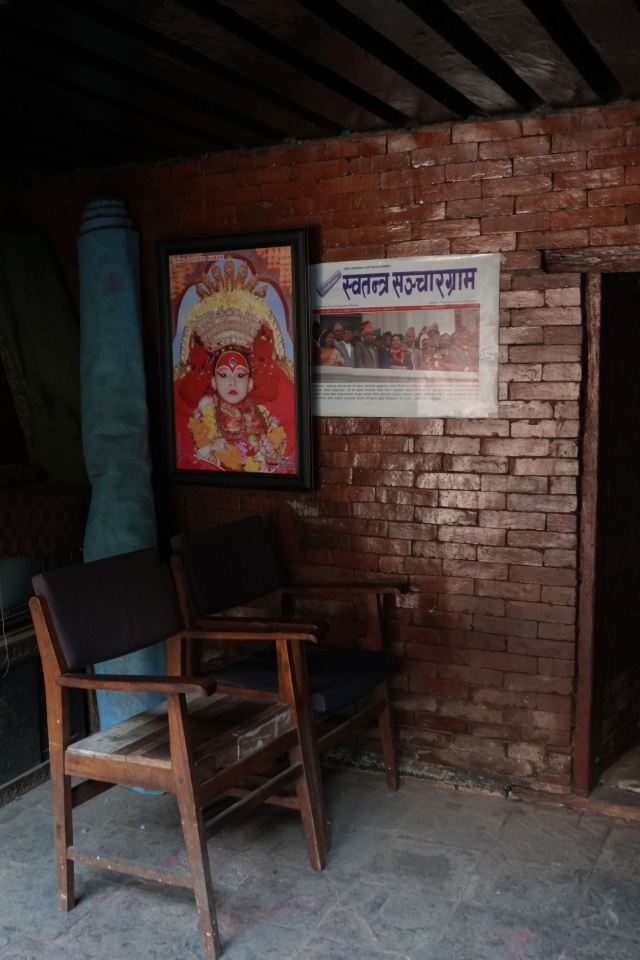 人们参观并崇拜尼泊尔的活女神“库马里”,他们在照片中短暂地出现在雕刻的窗户上。