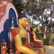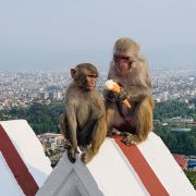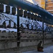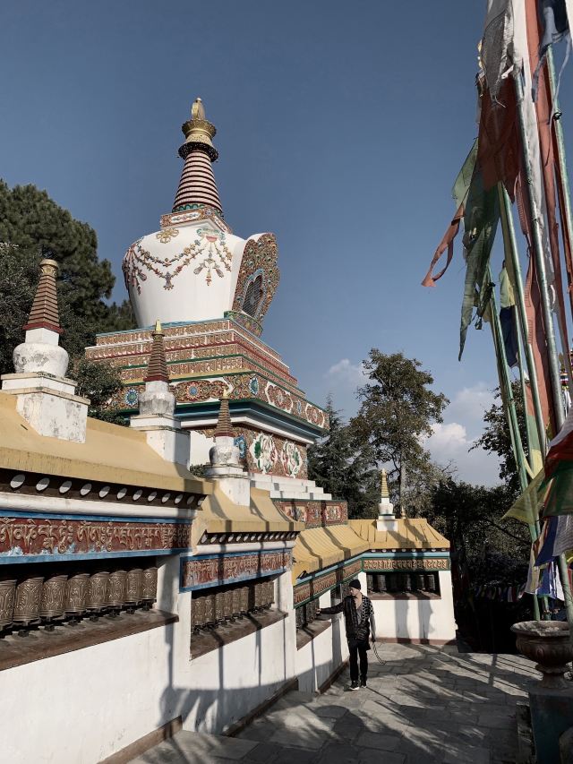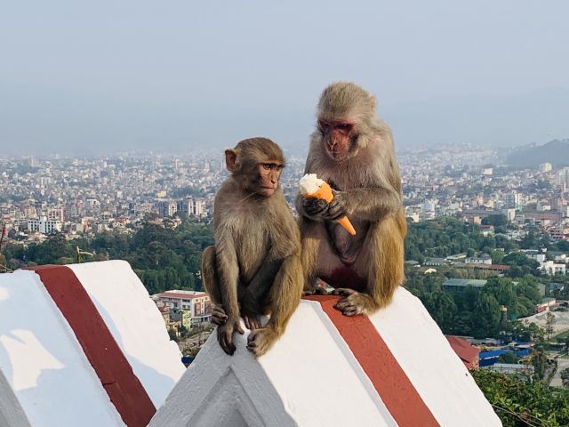 沿着上山阶梯走到顶端就是猴庙,一路上一直有猴子窜来窜去,手上别拿食物,否则都会被猴子抢走。来到这里,你会看到中央的金色大佛塔,虽然比外形与其相似的博达哈大佛塔要小些,但因伫立在山顶而显得气势非凡。