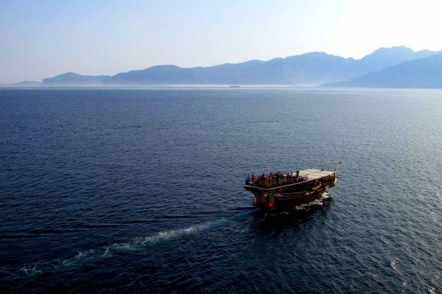 Musandam海豚湾上地形壮丽、独特,是著名的看海豚的线路。游客可以搭乘单桅帆船或小艇前往探访峡湾景色并追寻海豚的身影。