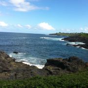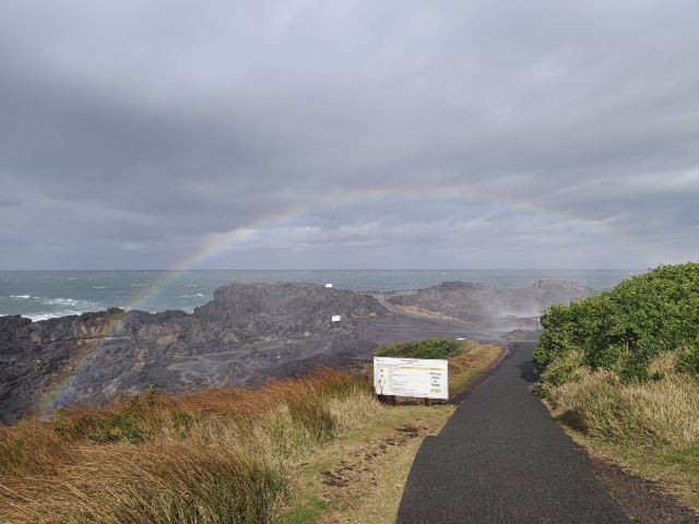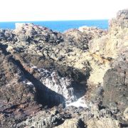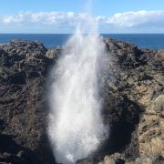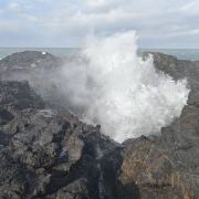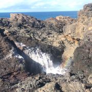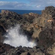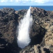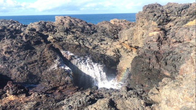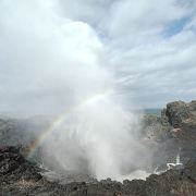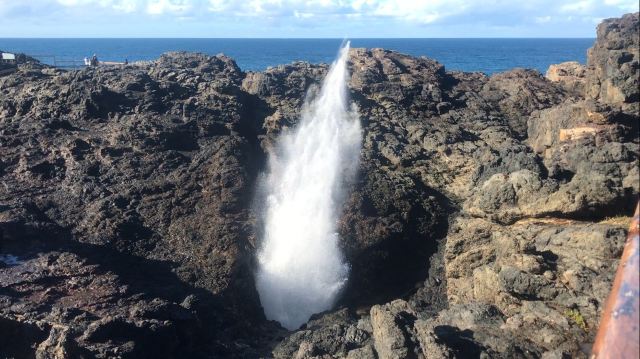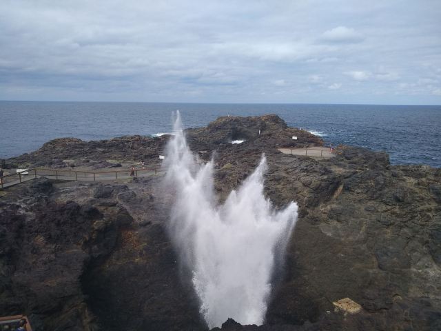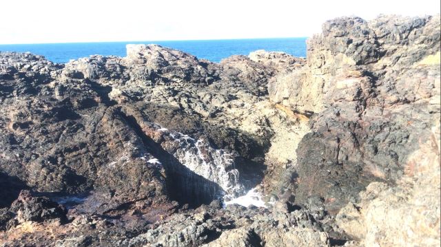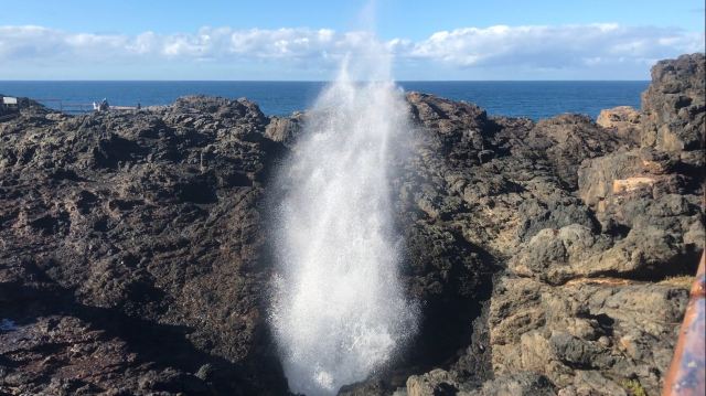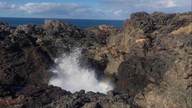 凯阿马喷水孔是位于基亚玛小镇灯塔旁边的地质奇观,海水通过狭窄的通道灌入开口向上的海蚀洞里,水压陡升,每隔几分钟就会喷溅出壮观的水雾和浪花,并伴随着巨大的声响,幸运的话,在海浪喷泉的瞬间还能看到彩虹。