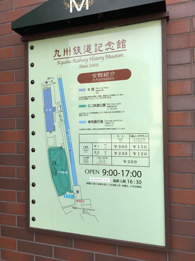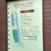 九州岛铁道纪念分为馆内展览和馆外展览两部分。馆外展览分为车辆展示场和迷你铁道公园。车辆展示场里有两台蒸气火车头与五辆行驶于九州岛地区的退役车辆和一台载送石炭的货车,部分可供游客上车参观。迷你铁道公园是一个小型的铁道游乐场,游客可以乘坐装扮可爱的电车绕行公园,这些列车都是现役行驶于九州岛的四种特急车与一辆近郊电车,当然这个是需要另外付费的,一趟是300日元。