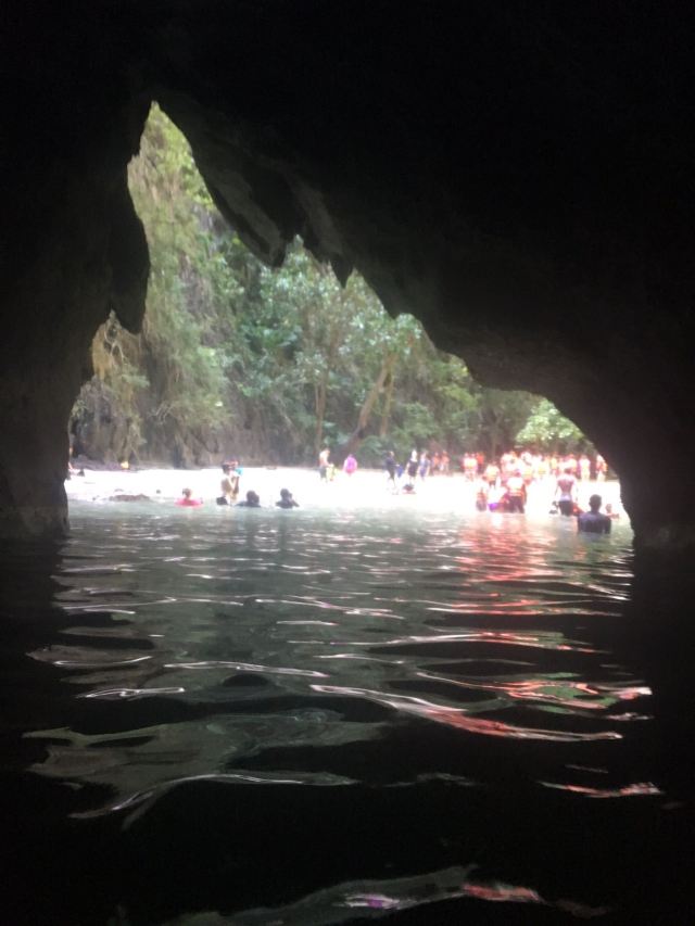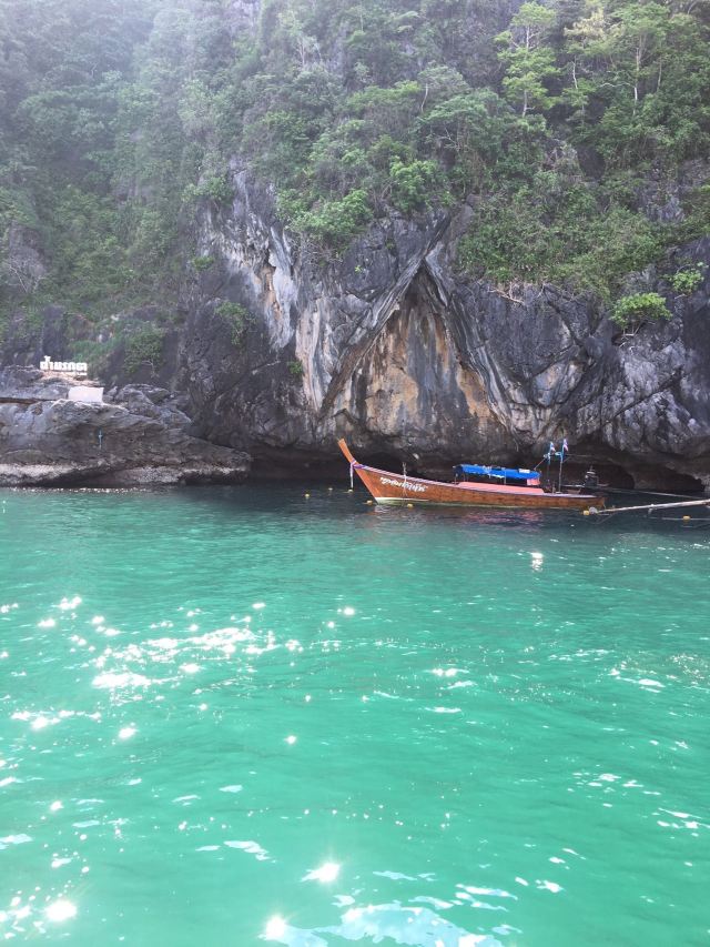 位于珍珠岛的西边峭壁直立的地方,游人需要游过宽不过10米,长70米的通道方可进入洞里,在低潮位时可通过小船。里面就象一个没有屋顶的大房子,周围由石灰岩峭壁围成,有翡翠色的海水和白沙滩,这里因这奇特的景色而闻名于世。游人只能付出一些努力穿过洞的入口,才能欣赏那些美妙的自然景色,要想更好地保护这一自然奇观,比较好的游览是以划艇这种友好的游览方式造访这里。外边的光线穿过洞口,将翡翠的水影反射到洞里,看似仙境令人难忘。翡翠岛(Morakot Cave)因此而得名。当抵达洞的另外一边,陡峭的悬崖被白色的沙滩所包围,天空之上看起来像一个火山口,这是大自然创造的魔法。