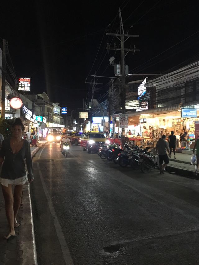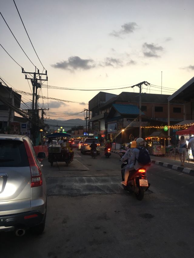这里白天很安静,就是一条很普通的街道。但是到了晚上就变成了岛上热闹的夜市,大街两旁有很多餐厅、酒吧和小吃摊,你可以在一家店里坐定下来吃晚餐,或者干脆欢天喜地地一边逛一边用各种各样的泰式小吃填饱肚子。