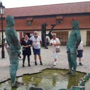 5分 超棒卡夫卡博物馆应该是一套完整的家宅大院,由于他老爹是个成功的犹太商人,因此房子也比较阔绰,大门是敞开的,直接可以进院子,我是从他家院前面的礼品店里进来的,小店里整整齐齐的摆放着各种造型可爱的小饼干,进到院里是一对可以喷水的《撒尿雕塑】,还有一对三米多高的两个《K》雕塑,后面的小二楼才是陈列文物的,我到后面房间过厅,一个整洁精致的老太太坐在接待台后面,要求我出示票,我问她在哪里买票,她说在前面的小礼品店里,我刚要转身去买,她叫住我问几个人,从哪里来?我说一个,从中国来,她说算了,不用买票了,我很不好意思,掏出所有的当地货币克朗,一张1000的和几枚硬币,说大的太大,小的太小,最后实在不敬,免费参观了卡夫卡博物馆,参观后感觉心里不踏实,到卡夫卡家小礼品店买了一些小饼干,心里感觉才舒服一些,不能占人家文人的便宜。