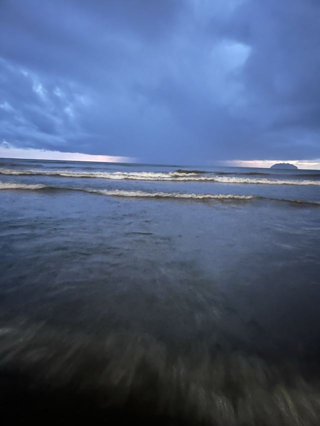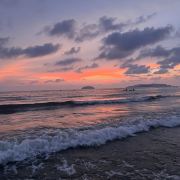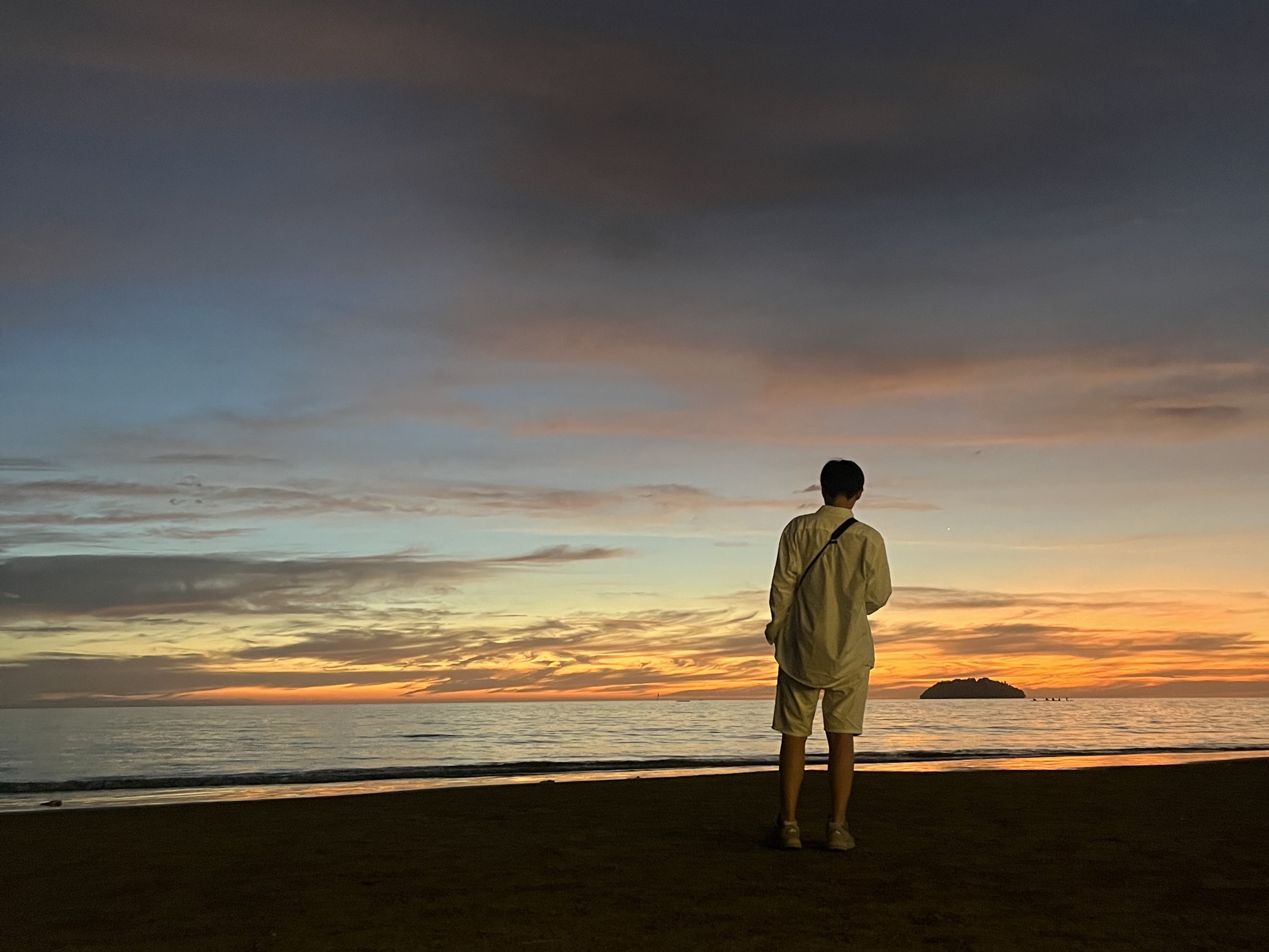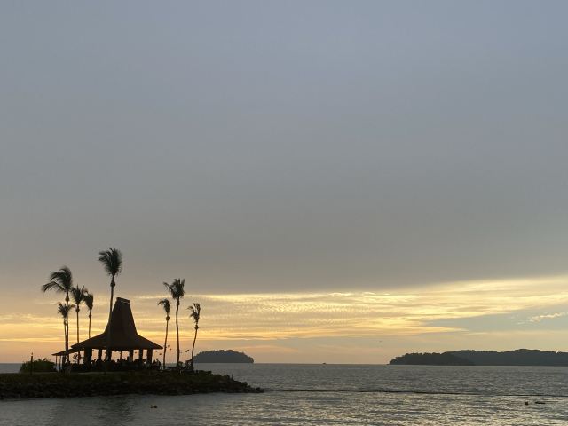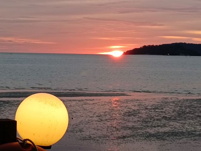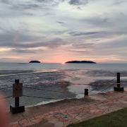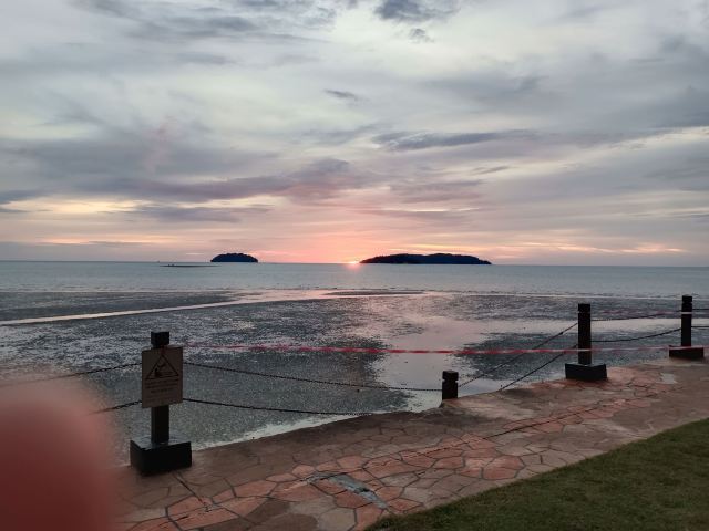 虽然日落的时间大约也就5、6分钟,但你还是可以看到明显的过程。日落前远处可以看到东姑阿都拉曼国家公园。然后太阳开始慢慢接近海平线,渐渐地,你可以看到小渔船刚好经过半边投入了海中的夕阳。云有些蓝里透红,淡淡的火烧云,非常梦幻。白色浪花卷卷袭来,珍珠光般的粉色倒映在水面,就好像在海水中打翻了腮红。