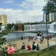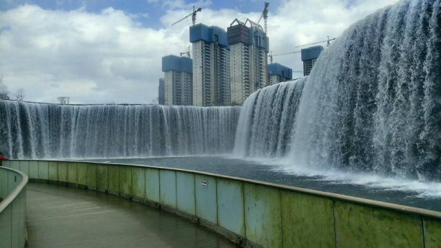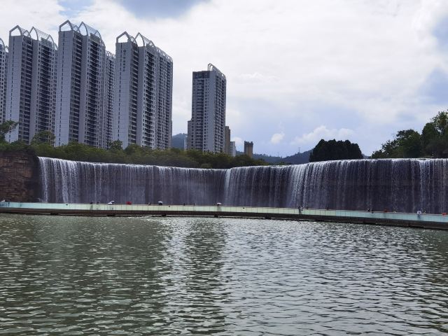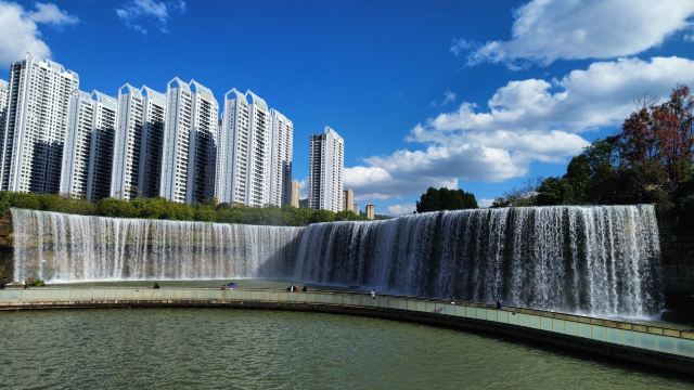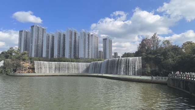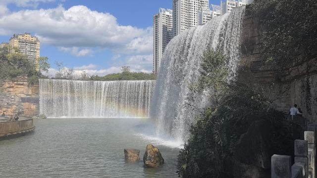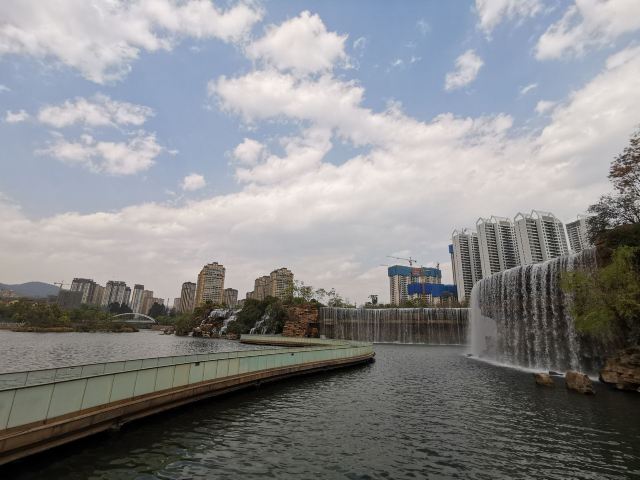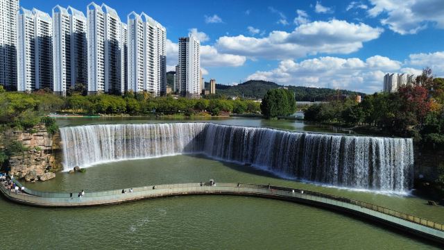 4分 满意瀑布公园于2013年开工建设,总投资约11亿元。该公园位于牛栏江——滇池补水盘龙江入口段,进入公园就感受到空气中的湿度明显增加。公园的瀑布景观区充分利用牛栏江引水入滇工程而形成人工瀑布及湖泊,其利用约12.5米的地势高差,建设成宽幅约400米的人工瀑布。在瀑布前方的水面上建有观景桥,可近距离观景。据悉,该人工瀑布属国内幅宽最大、流量最大、规模最大的人工瀑布。现在是枯水期瀑布也变成了涓涓细流!公园里有个扑腾乐园!适合带孩子在里面玩乐,大人在旁边喝咖啡!东边广场上有个龙九子的柱子,可以带孩子学习一下!就是这几天法治广场旁边在维修,吊桥那边过不去,春节应该是可以弄好了!