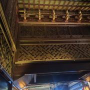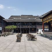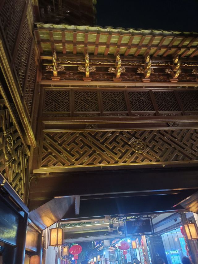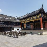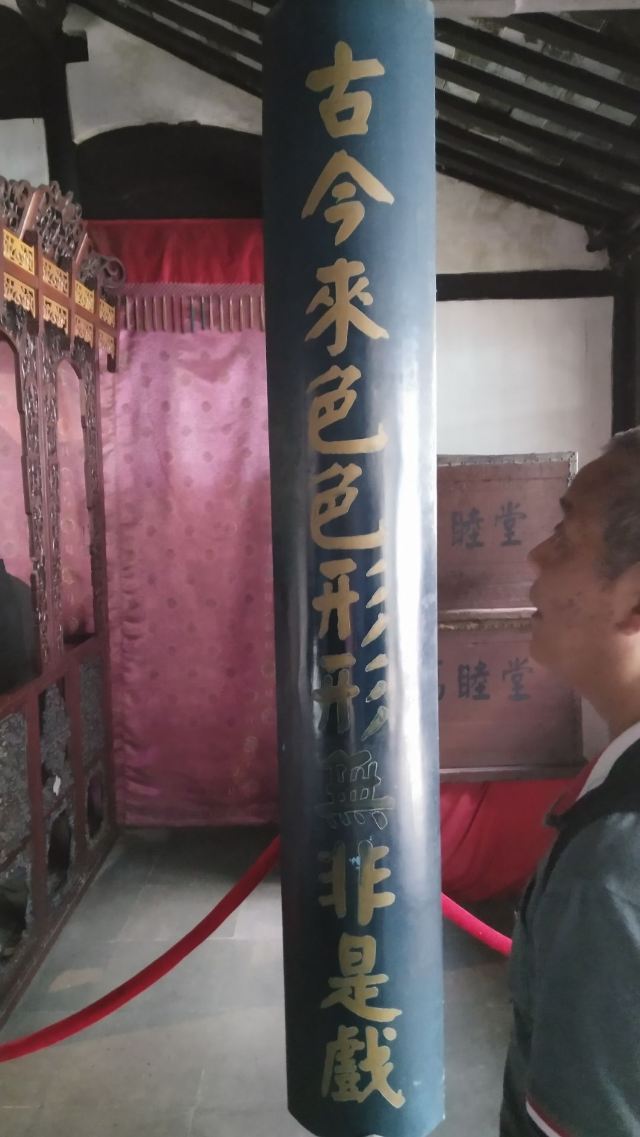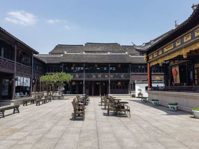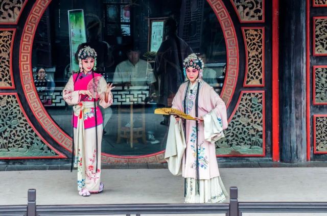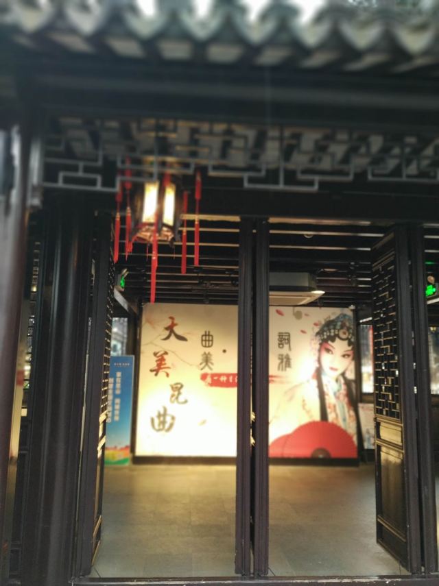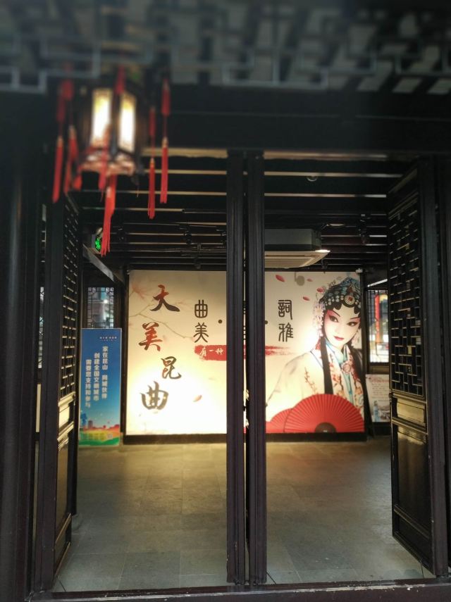 古戏台中心众多的木雕凤凰构成了凤凰藻井,这是利用共鸣原理筑成的“高级音响”,能使这里的演出更加婉转动听。具体演出时间、曲目可以关注一下古戏台门口的招牌,一般来说周四演锡剧,有《珍珠塔》等曲目,除周四以外的周一-周日演昆曲,有《牡丹亭》等曲目。你可以坐在露天广场的椅子上看戏,也可以到戏台对面的茶室,买上茶点,边吃边看。