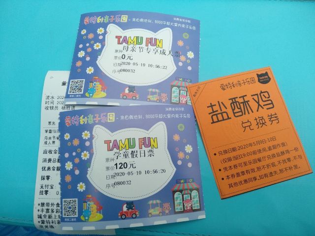5分 超棒母亲节去的,原来订了一大一小票142元,到店后发现母亲节可免母亲票,只收娃的节假日门票120元,还送份盐酥鸡,这真是母亲节的好礼物,退了网上的票,现场付120买了(某二手平台更便宜但要邮寄实体票)。