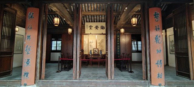 千灯古镇南端是提出“天下兴亡,匹夫有责”的明末清初思想家顾炎武的故居,门面不张扬,里面比想象的要大得多。故居老屋门楼上的砖刻值得一看,往南有顾炎武墓(亭林墓)和亭林祠,往西更深处,是园林式的顾园。
