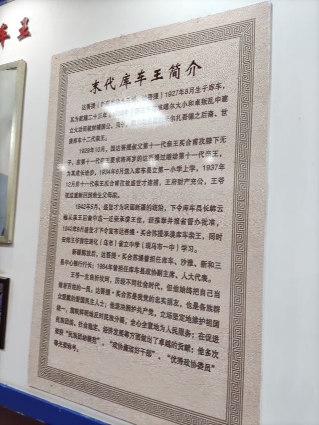 龟兹文化展览区展示了新疆历史上龟兹国的文化风俗,有众多的文字图片说明,有龟兹佛教的珍贵文物展示,还展示了龟兹古国的生产工具、钱币和民间工艺品等文物。老城墙是王府内古老的建筑,可以简单看看。为重点的参观区为王府区域,这里按照曾经王府的原样展示,内部有曾经历代库车王使用过的物品展示,还通过蜡像复原了曾经王府一家的生活场景,可以一一参观,感受曾经库车王的生活氛围。需要注意的是,原来居住在王府内的后一代库车王(也是中国后一位曾被中央政府承认的王爷)达吾提·买合苏提已于2014年7月30日辞世,现在前来游玩已经不能得见这位王爷,仅能在王府参观。