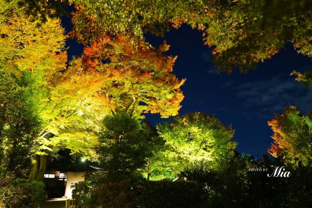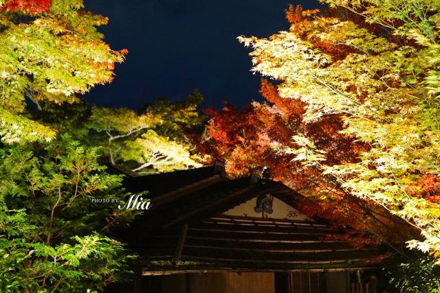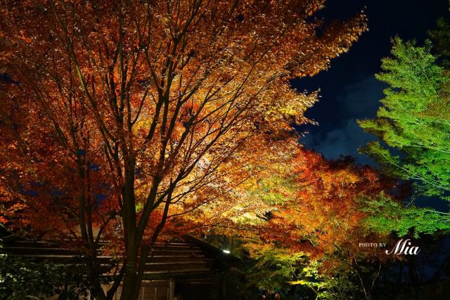 门票当年是600日元,如果要一起参观圆德院,美术馆,要买套票。寺院的规矩都差不多,脱鞋,拿袋子拎在手上,安静参观。庭院也是很大,有山有水,红黄绿相间的枫叶高低错落,在夜晚灯光的照射下,别有一番神韵。还有片竹林,感觉比岚山的竹林好看些。晚上风挺大的,略有凉意。