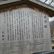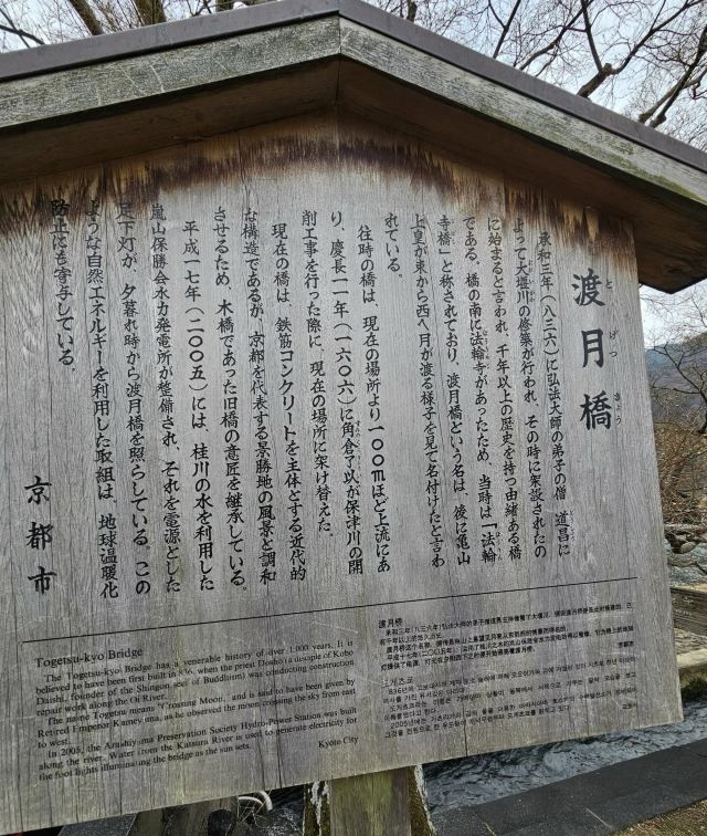 渡月桥别名岚桥,横跨在京都岚山的大堰川上,全长155米,据说是空海的弟子道昌于日本平安时代初期的836年(日本承和三年)整修大堰川时所建。秋季时,在红叶陪衬下的这座桥融入岚山景致,成为代表京都的明媚景色。