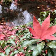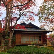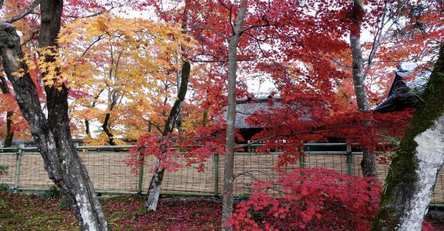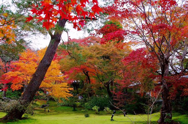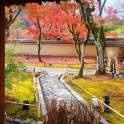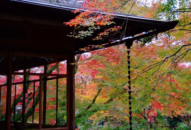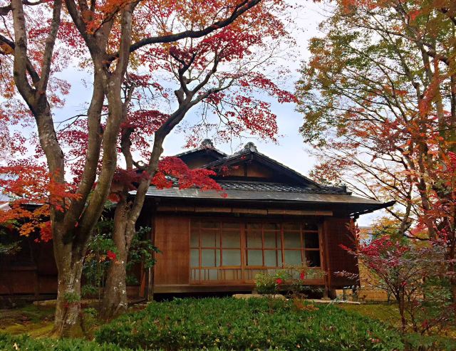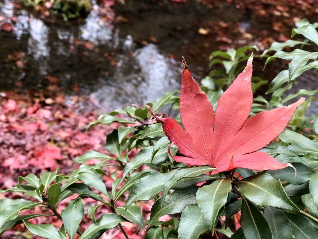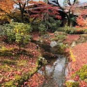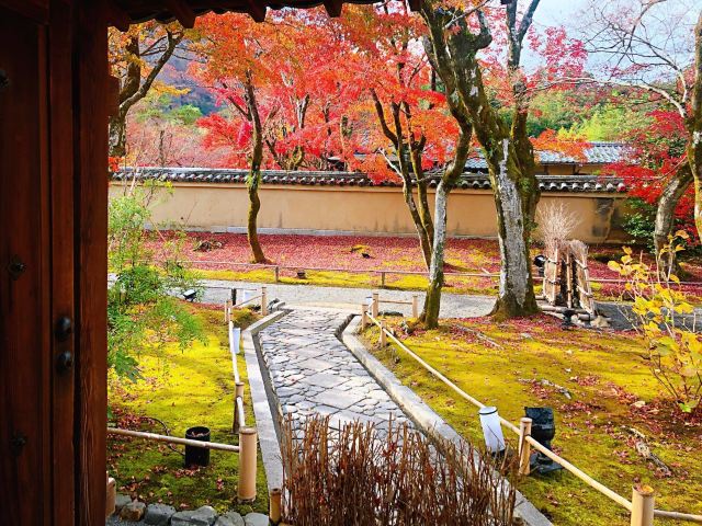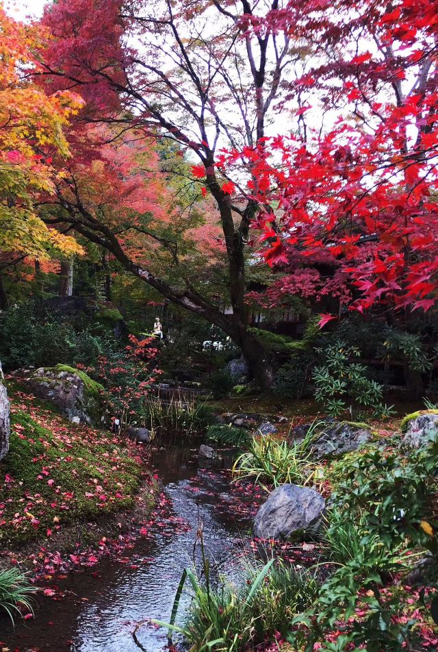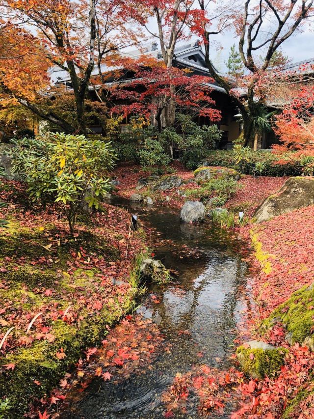 整个庭院占地不大,园内遍布青苔和随处可见的枫树,我是11月下旬到访,这时满院子的秋色已经藏不住,在院外就已令人神往,进入院中一步一景,令人驻足回味。枫叶千枝复万枝,一株比一株红艳绚丽,飘落的枫叶铺满小径,还有许多浮在水面上,与地面的青苔相得益彰,此时的你漫步其中,会觉得时间都静止了。