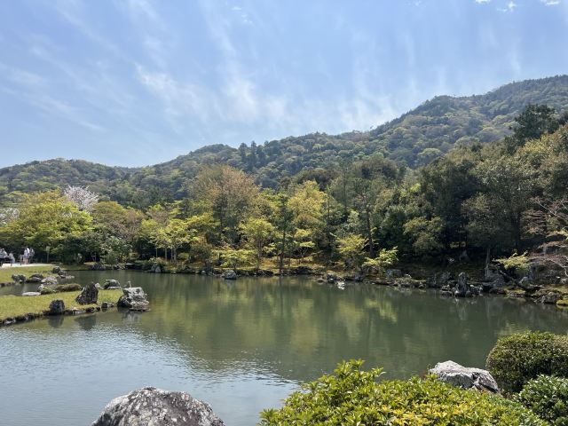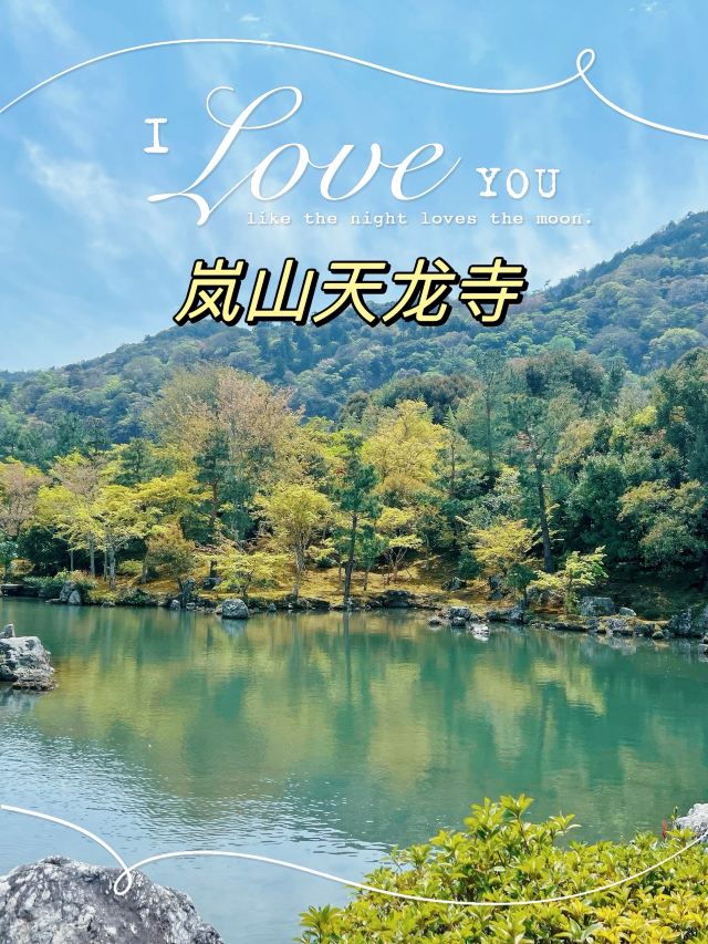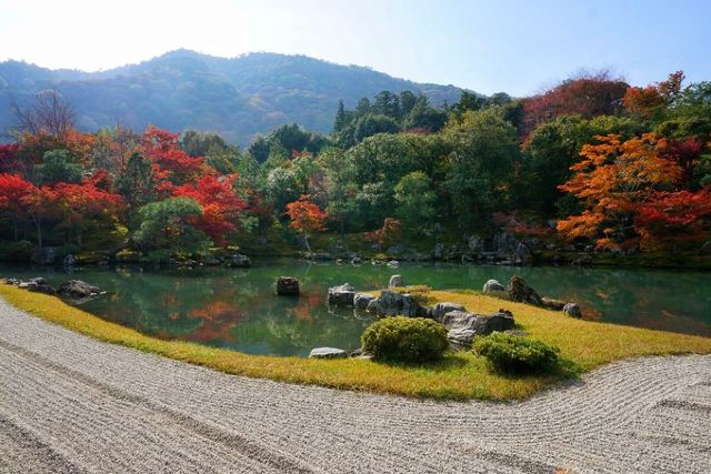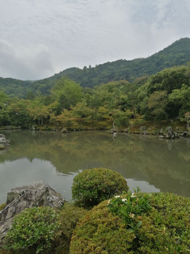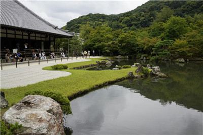 走过一段坡路便来到了精华曹源池,曹源池庭園在700多年前由梦窗疎石设计,现为日本史迹特别名胜。这是池泉回游式庭园,可以绕着池子走一圈欣赏不同景致。曹源池的对岸,设置两块巨石所砌成的龙门瀑布,底下放置着鲤鱼石,有“鲤鱼跃龙”之意。整座曹源池借着后方的爱宕山、小仓山、龟山、岚山做背景,使曹源池看起来犹如巨型画作般精彩。池边各式树木、石头,倒映在池面上别有一番禅意,不止大器,庭园中一角一景都十分精致。