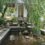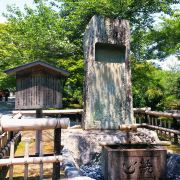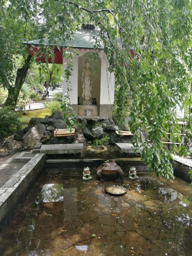 接着来到多宝殿,多宝殿里的祠堂供奉着后醍醐天皇的雕像,雕像的两侧则是历代天皇的牌位。殿前有两颗枝垂樱,春天时候粉红色花开非常美丽。多宝殿前“平和观音与爱之泉”,很多游客不能免俗会丢硬币许愿,所以池中青蛙面前的荷叶上满是硬币。