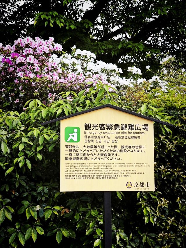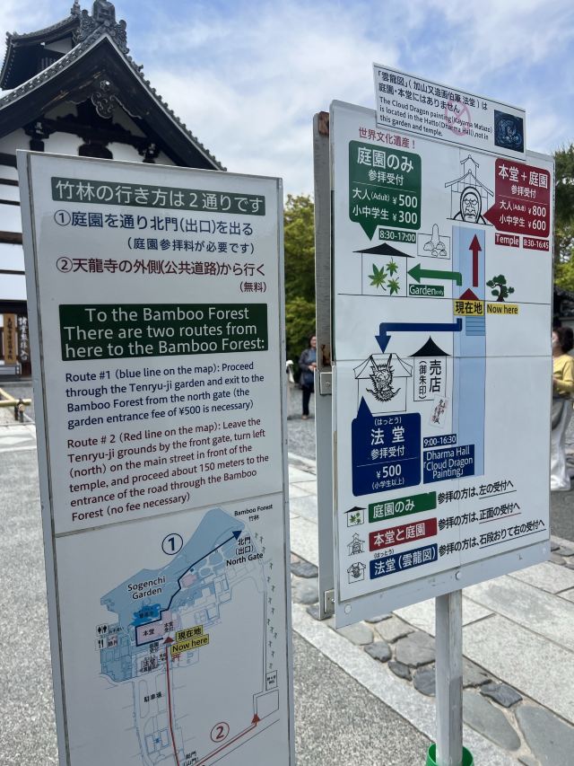 天龙寺是一年四季都很有逛头的寺院,寺内的建筑繁多,包括东西向主轴线上的法堂殿、大方丈殿及曹源池庭園,轴线以南的禅堂、友云庵、龙门亭,和轴线以北的祥云阁、多宝殿、百花苑等。岚山竹林位于寺院的北面,如果先走竹林小径可以从寺院的北门进入。反之,可以从渡月桥进入岚山,从寺院正门进入,参观完毕后从北门出,接着走竹林小径,参观野宫神社。
