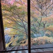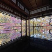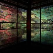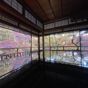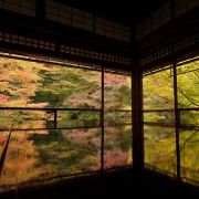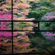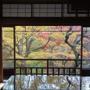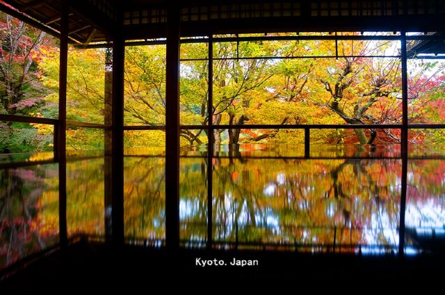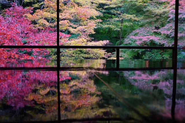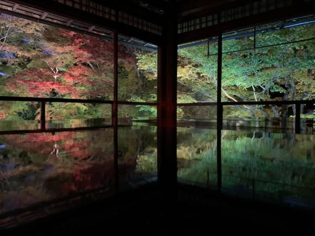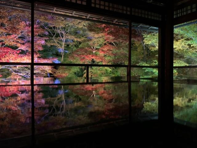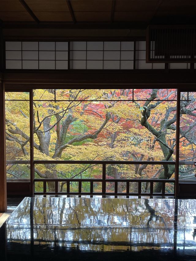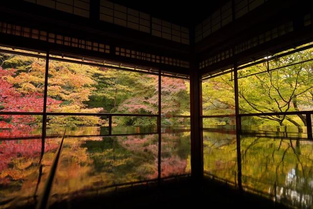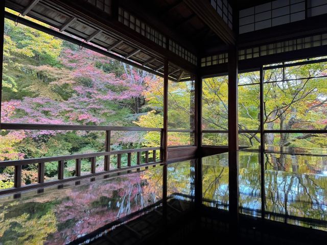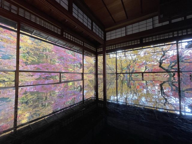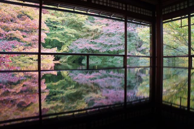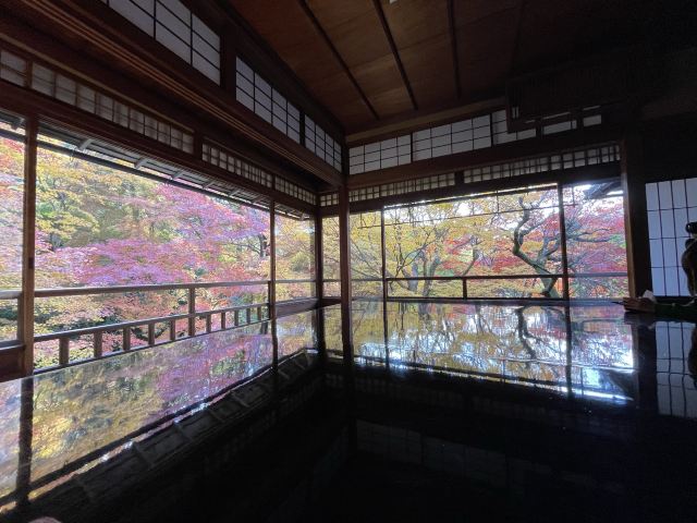 瑠璃光院一共有两层,每一层都如我们看到的一样没有门窗或者是玻璃的门窗,在房间内有一个比较大的桌子,我们拍照时下半部分倒影出来的景色就是这个桌子倒映出来的。他的景色就是我们能从照片上看到的那个样子。