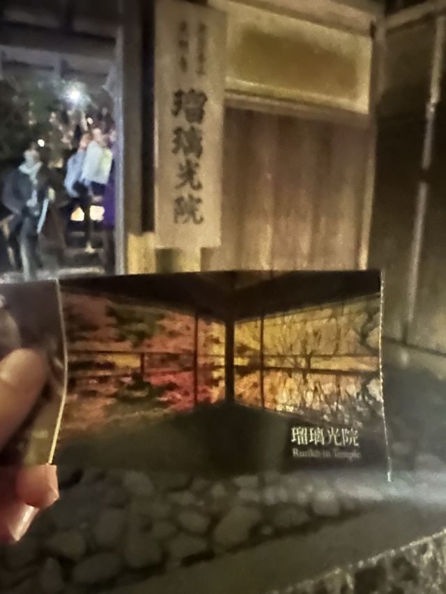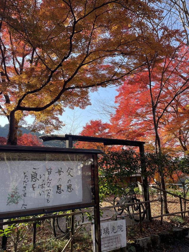 从三千院出来乘巴士,八濑站前下车。步行前往入口,这一路风景也是美得醉人,除了大片的红枫,还有小桥流水,小山瀑布,随手一拍都很美好。有个男生举着牌子引导游客买票,门票上会写是几点场次,还会给个小袋子。再往里走,继续排长队。瑠璃光院人气真的很高,不停地排队。门票也是三千院的几倍,但是地方其实要小很多。