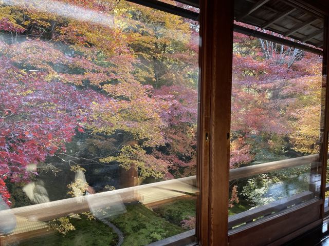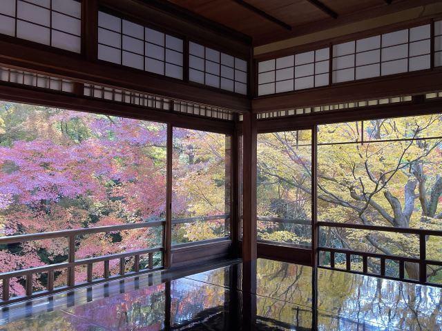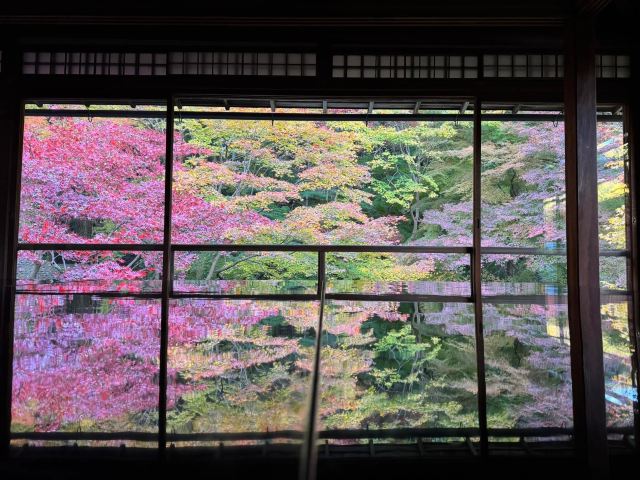 二楼内厅的另外一个角落,坐满密密麻麻都是拿着相机的人,只听见不停的咔嚓咔嚓的快门声,没有其他一丝嘈杂。在这敞开的大窗户前的榻榻米上摆了一张黑色反光的矮桌。窗户四周没有玻璃等遮挡物,规整的木格充当了画框,增添了艺术的画面感。黄、橙、桃、红、绿等多色渐变的枫叶呈现在人们的视线中。窗外的五彩的枫叶透过低处的矮桌形成了倒影,互相辉映,美轮美奂,美的令人窒息。