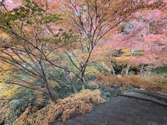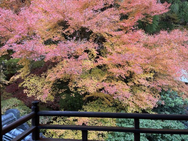 日式屋廊与五彩枫叶和谐搭配,层林尽染斑斓意,是日本赏枫的佳选。别处的红叶只有红黄两色,这里还有粉色,登上楼台三色交映,看得人仿若在幻境之中。