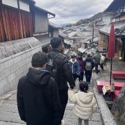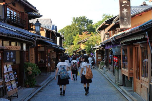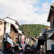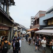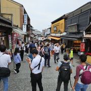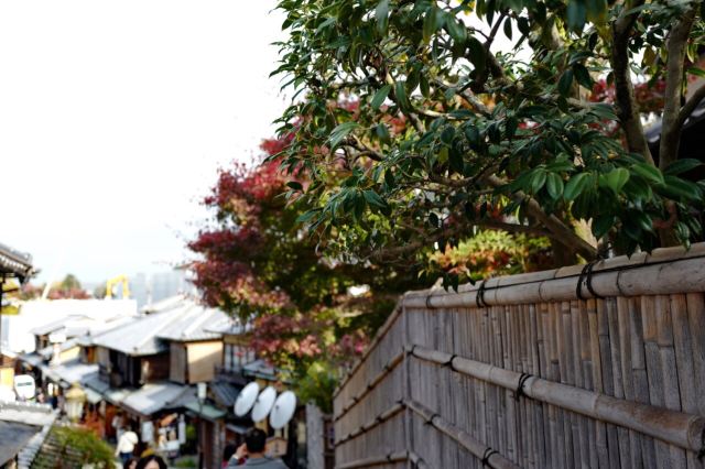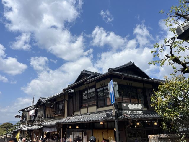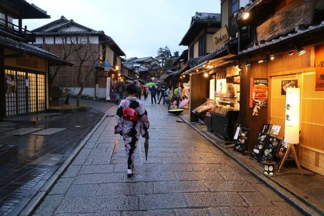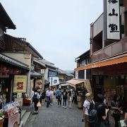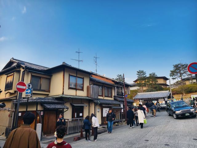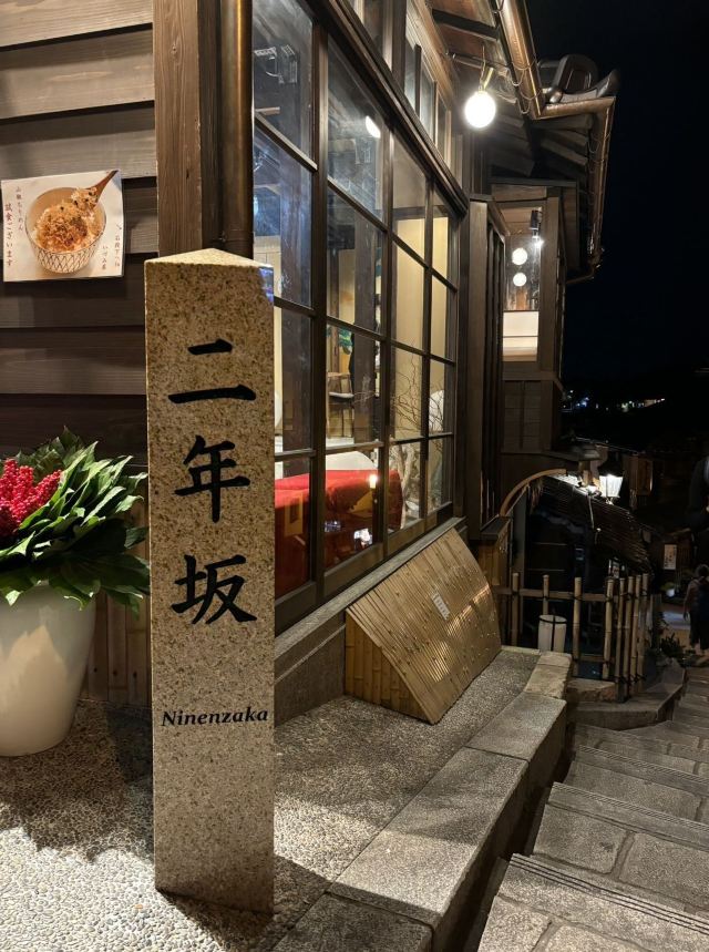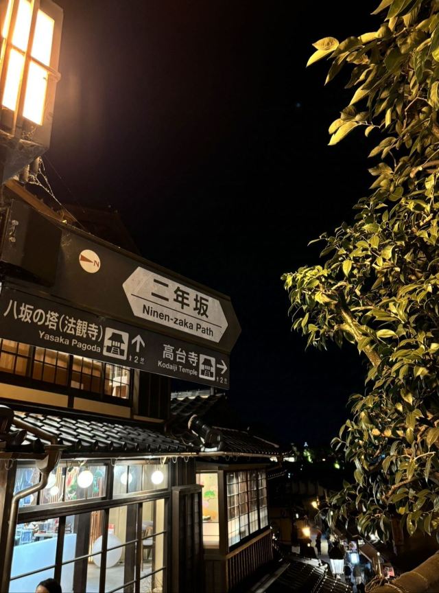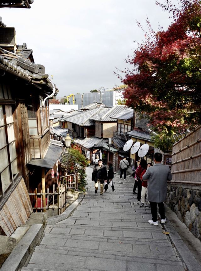 三年坂二年坂是通往清水寺的小石头坡道,与清水坂一样是历史保护街区。这一带道路的两侧都建有木质结构的老房子,开设了饼屋、纪念品商铺、京都特产古风瓷品店等,也有茶屋和咖啡馆,赏夜枫季节,店铺生意非常好。