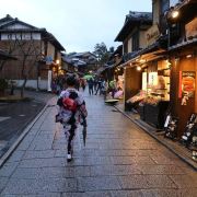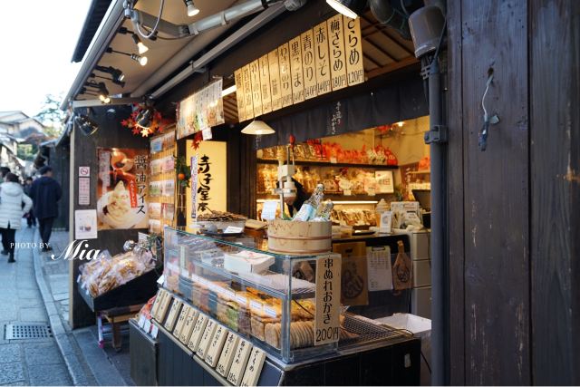 相比于游客熙熙攘攘的清水坂,三年坂和二年坂要清静一些。路边很多小铺子虽然看起来不太起眼,但只要你有足够的时间,准能淘到不少好东西,如传统风格的小饰品、和服、手帕、小点心、日式餐具以及各种印有清水寺图案的纪念品,还有京都特产化妆品“优佳雅”等特色店铺,是在京都买手信的好地方。