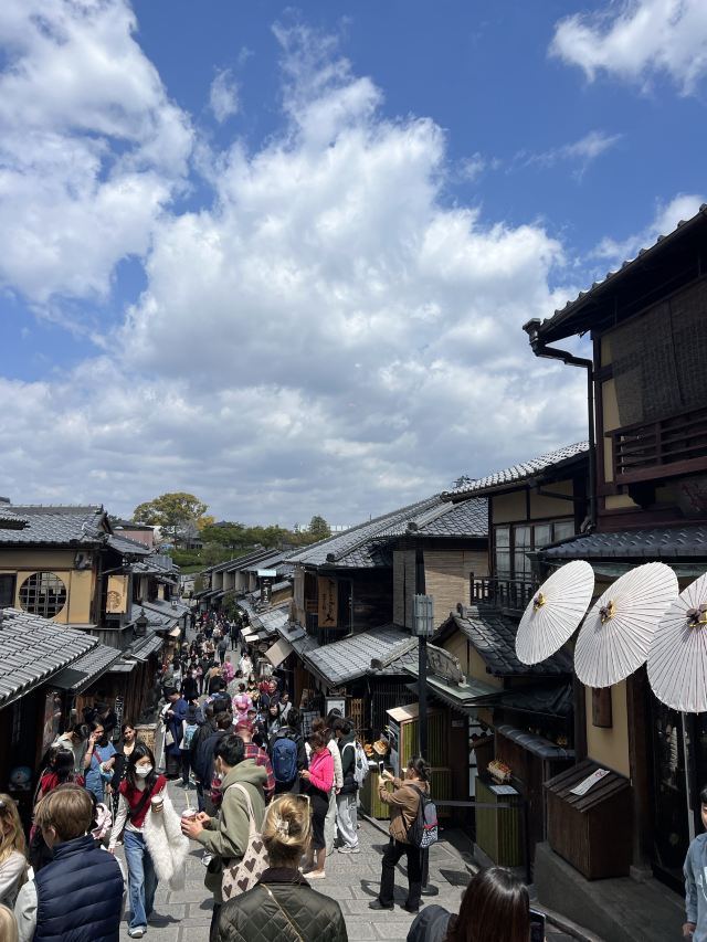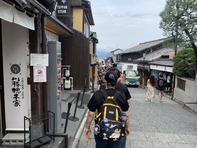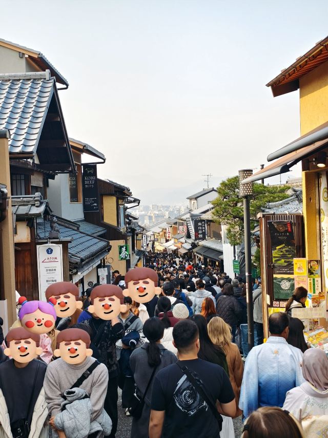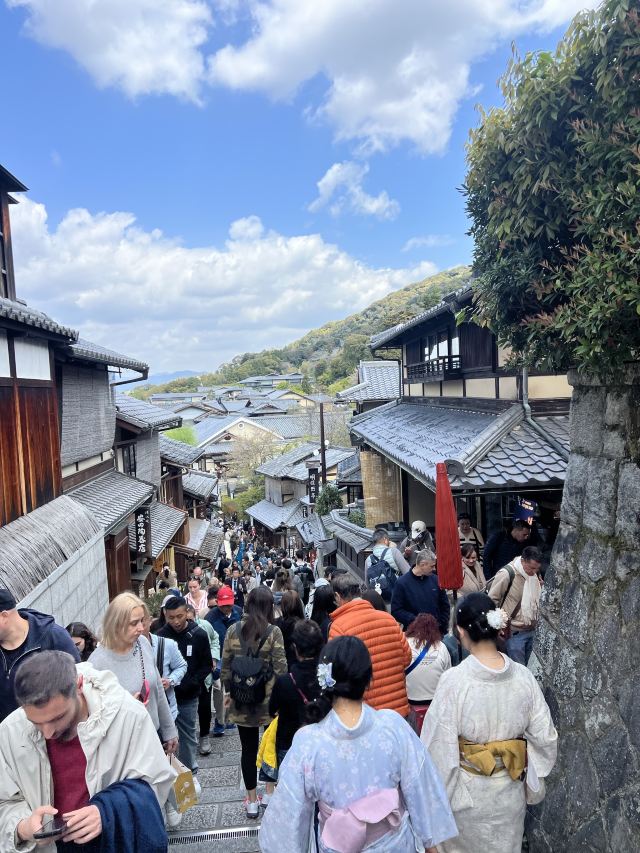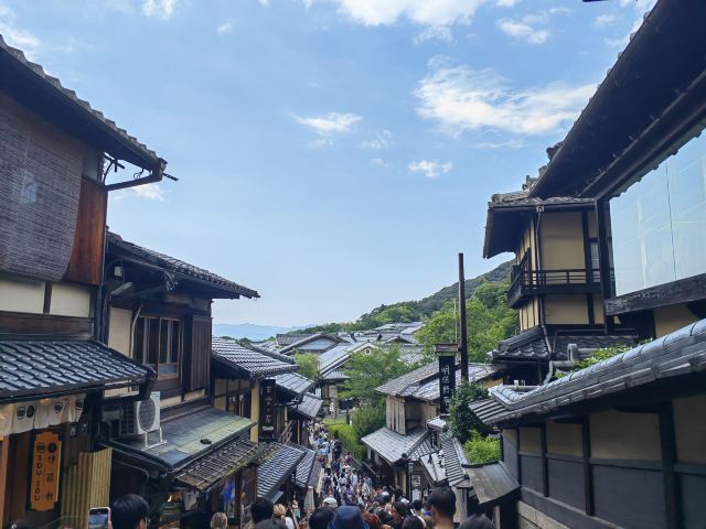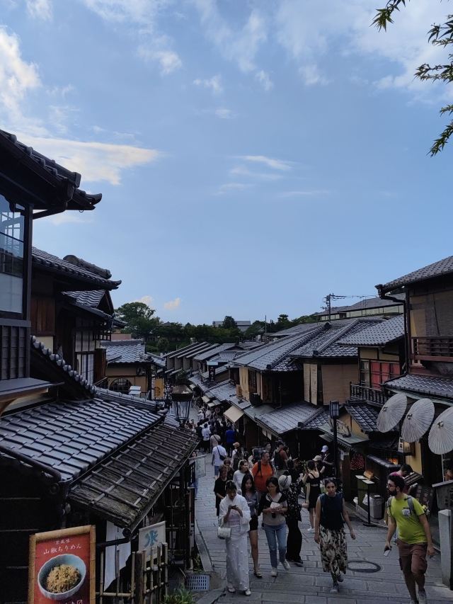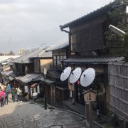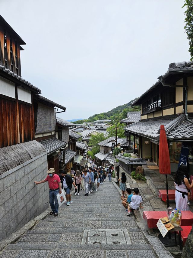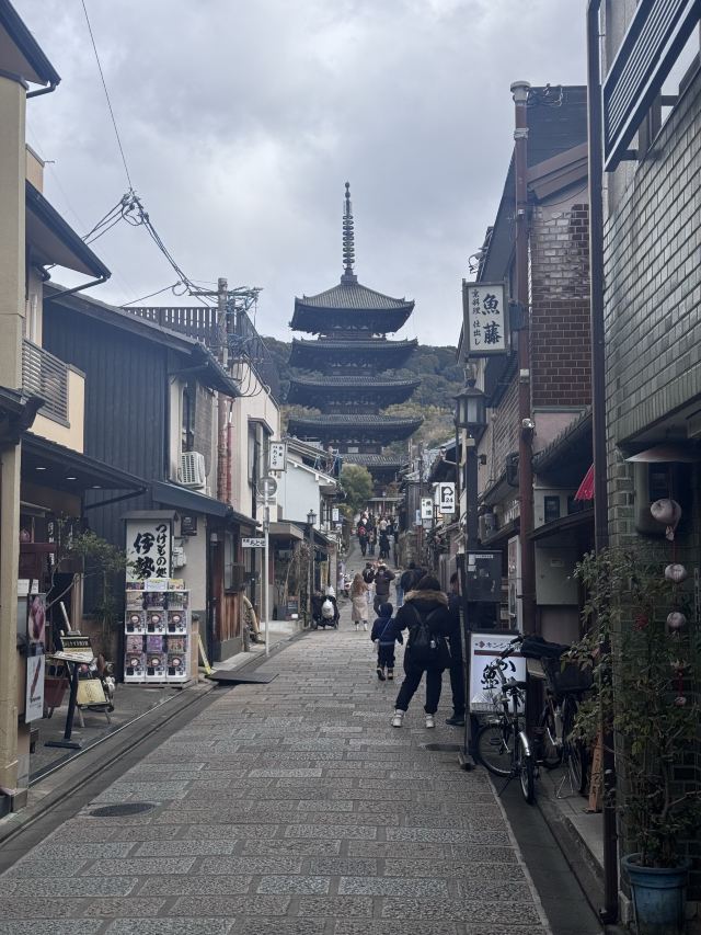顺着二年坂走到底就到了三年坂,一直通往清水坂。由于经常有产妇为了去清水寺祈求顺利生产,再加上日语中的生产平安“产宁”与“三年”发音接近,所以三年坂也被称为产宁坂。三年坂的石阶比较陡,无论是漫步观景还是找角度拍照都别有一番韵味。