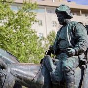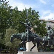 西班牙广场的中心,树立着伟大的西班牙作家塞万提斯纪念碑,塞万提斯雕像端坐在纪念碑前,俯视着下方手持长矛、骑着瘦马的堂吉诃德和他忠诚的矮胖仆人桑丘的雕像,此外,纪念碑的两侧树立着代表堂吉诃德真爱的两尊石像:平凡的村姑阿尔东沙•罗任索和想象中美丽的杜尔西内娅·台尔·托波索。
