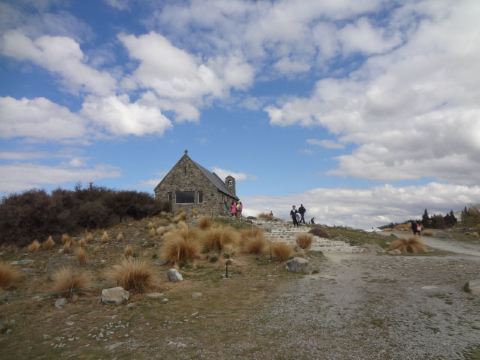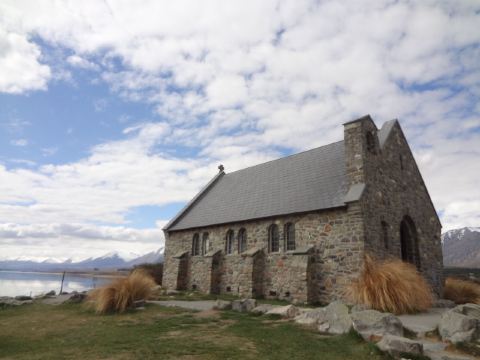 教堂虽小,但名气很大,白天会有旅行团的大巴陆续到来,晚上则常能碰到携带专业摄影器材来拍星星的人。走进教堂,左右两侧分别有五六排长椅,由中间过道走到窗边布道坛,一个十几厘米高的十字架立在玻璃窗户前,逆着光,窗外就是蓝天白云与湖水相映的美丽之景,还能望到远处的库克山。