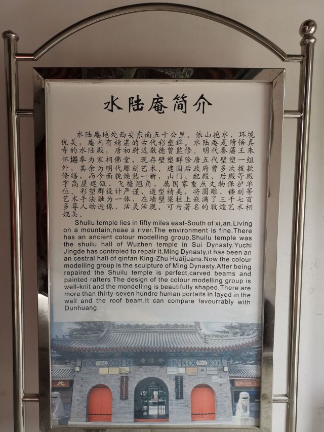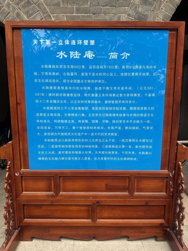 5分 超棒我是奔着王维到了蓝田,先奔辋川看过偶像家的遗存,对当地的文保颇感失望。听蓝田人介绍,县里最值得一去的是水陆庵,六朝古刹,壁塑了得,人称“敦煌第二”,不容错过。于是从辋川驱车赴水陆庵。其实蓝田县汽车站也有到水陆庵的公交,只是半小时一趟,很难等。古庵在王顺山下,可眺望八百里秦川,庵内壁塑确实不错,只是规模不大,意犹未尽。听说尉迟敬德(门神)曾任水陆庵监修,可见是“良心出品”。庵内无尼姑,凭身份证换门票可入。水陆庵也是蓝田人新年祈福的圣地,滴滴司机说小时候过年时都是走着去水陆庵,很喜欢这个地方。庵内壁塑受保护,禁止拍照,因此不做分享,想看的朋友不妨身临其境感受一下古代匠师的技艺。