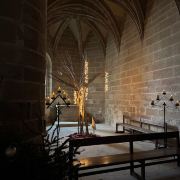 红褐色的石砌古城墙充满了浓厚的中世纪气息,顶部的金色大天使雕像在阳光下熠熠生辉。主殿内的拼花大理石地面十分华丽,高耸的拱顶古朴而典雅。正殿旁的回廊和花园极为幽静,很适合在此小憩或沉思一会儿,从回廊的观景平台上也可以俯瞰到教堂、街道和沙滩的美丽景致。