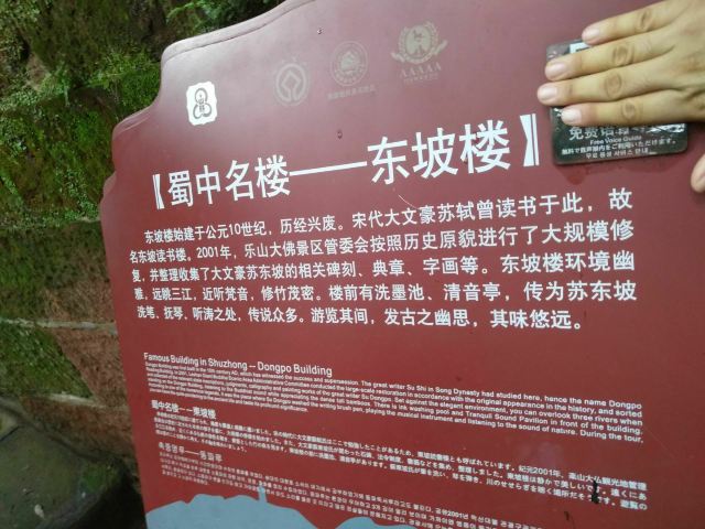 1、“东坡楼”位于“乐山大佛”。乐山大佛是大名鼎鼎的世界文化遗产,是全国最大、世界最高的摩崖石刻造像,开凿于唐代开元元年(713年),历经90多年才建造完成,因地处大渡河、青衣江和岷江三江交汇处的凌云山上,又称“凌云大佛”,古代官方名称为“嘉州凌云寺大弥勒石像”(嘉州:乐山古称),是乐山乃至四川旅游必打卡的景点,历史上留有苏轼、李白、岑参、黄庭坚、陆游、范成大、王士祯、郭沫若等名人足迹。