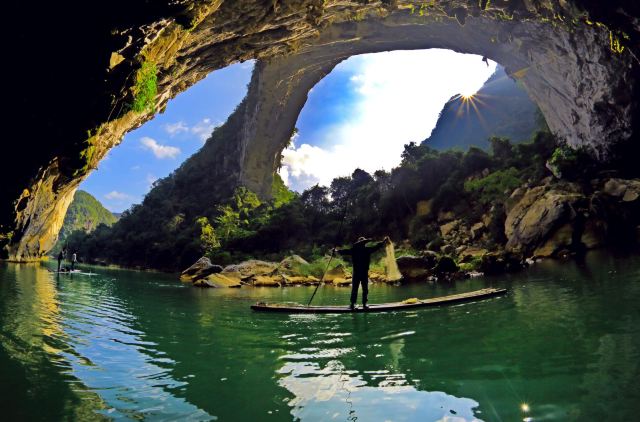 布柳河位于广西百色乐业县新化乡磨里村,乐业天坑以北,距离乐业县城51公里。壮语中布的意思是泉,柳的意思是酒,传说布柳河是远山里流出来的酒泉。沿布柳河顺流而下,两侧层峦叠嶂,群峰争奇。岸上林木茂密,盘根错节,常见“老茎开花”等热带雨林中才有的现象,林间猴子成群,树上百鸟齐鸣,被专家称为“植物的王国,鸟类的天堂”。河滩上礁石林立,还有甘蔗洞、出鱼洞等溶洞,相映成趣,妙景连连。布柳河神奇的是一座由三座大山坍塌形成的天然石拱桥,当地人称之为:仙人桥。仙人桥高145米,跨度177米,仿佛一条巨龙,横跨在布柳河上,气势雄伟,被称为世界上大美的水上天生桥。