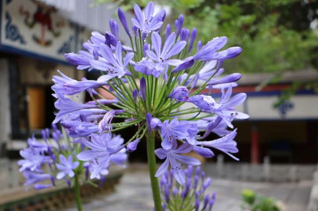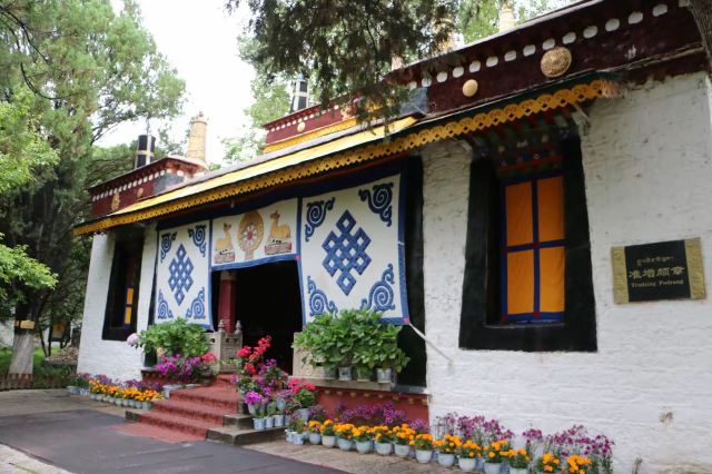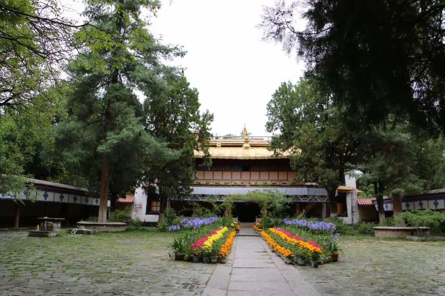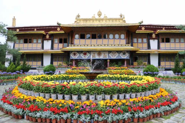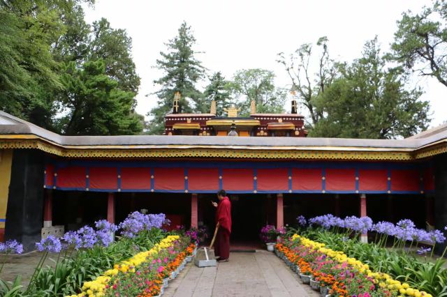 罗布林卡内的树木很密集,共有100多种植物,其中还有取自西藏各地甚至内地和国外的名贵花卉,被称为“高原植物园”。一走进园区便有浓密高大的树木出现在眼前,掩盖了内部的建筑,只有脚下的宽阔石板路引领人们向前。由于游人不多,使得园内有难得的静谧之感,阳光穿过浓密树叶漏洒在石板上非常安静,周围两侧的花朵多种多样又色彩斑斓,景色在拉萨十分难得。