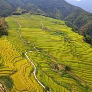它被誉为中国十大较美梯田,1000多亩梯田呈M字型分布在欧家村周围,是广东省规模大、原始生态的梯田。层层叠叠的梯田依山势延绵而下,蜿蜓起伏,婀娜多姿,阡陌纵横,移步换景。随着季节的转换,梯田呈现不同景观。
