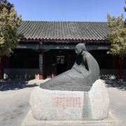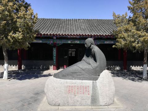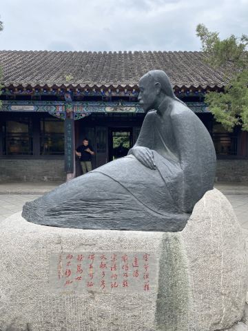 ✍纪念馆大厅正中是一座高两米多的曹雪芹塑像,曹雪芹身着长袍坐在一块大石头上,右手握着书稿,双目若有所思地正视前方。