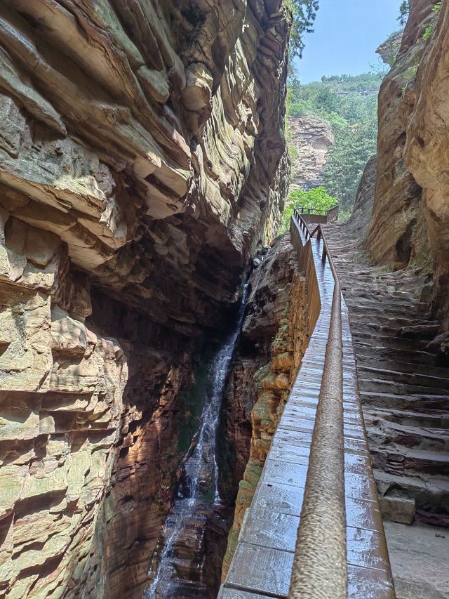 1. “斧劈刀削”的峡谷险峻踏入“瓮圪廊”峡谷,你会瞬间理解什么叫“大自然的鬼斧神工”。两侧赤色悬崖垂直落差高达百余米,如巨斧劈开,最窄处“一线天”仅容一人通过。行走在悬空栈道上,抬头是“一线天光”,低头是深邃谷底,惊险与壮美并存。