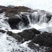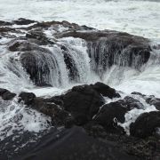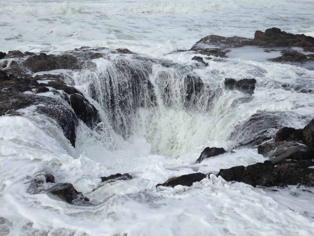 Thor's Well位于亚查茨附近库克峡谷以北的岩石架上。当潮汐合适时,水从玄武岩海岸线雕刻出的凹陷中涌出,然后流回开口处。这样的结构通常需要很长的时间形成。它开始时是一个海蚀洞,由于洞顶坍塌,留下一个开口。潮汐从下方涌动,水以巨大的力量向上喷射,形成了现在的景观。
