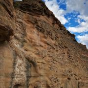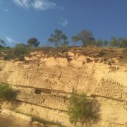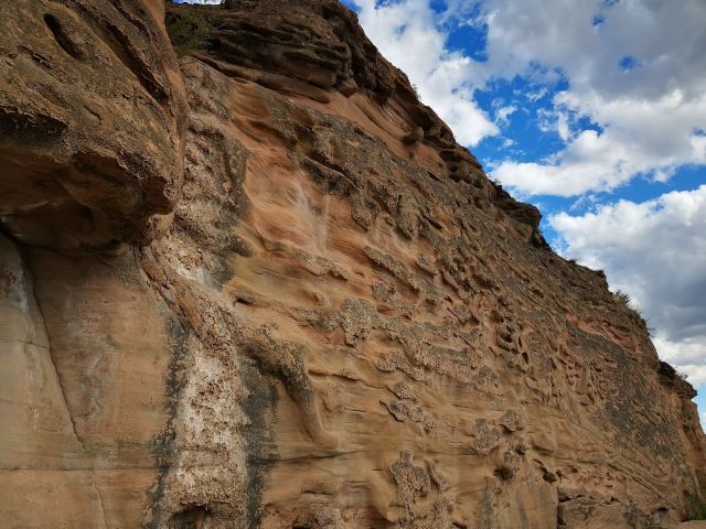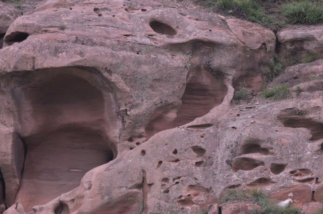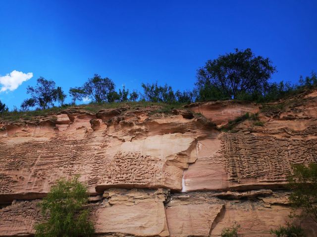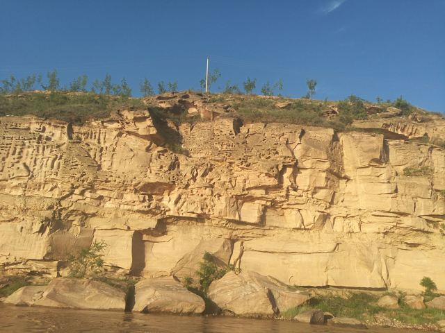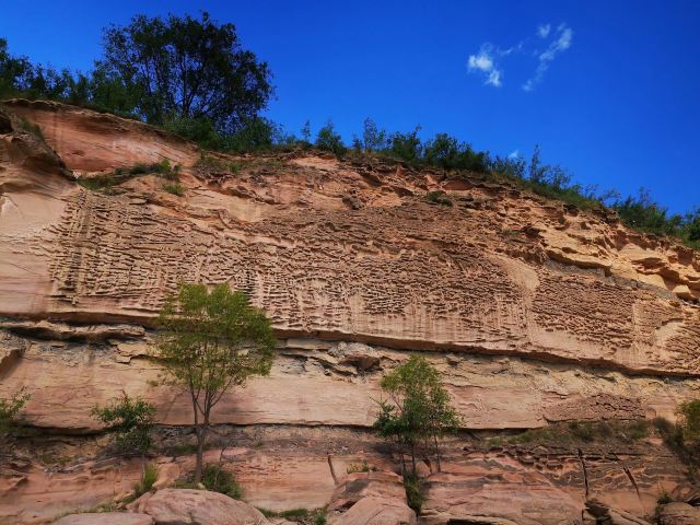 5分 超棒黄河画廊又叫黄河百里水蚀浮雕,位于晋陕黄河大峡谷碛口段,是世界上珍贵的自然遗产,形成于三叠纪,由地下水溶蚀与河流冲蚀作用复合于三叠系厚层砂岩而形成的天然崖壁浮雕。由于厚层砂岩内含有大量的正长石和石英石,在水溶蚀、河流冲蚀、风蚀和日照条件下正长石逐渐分化分解,石英石从厚层砂岩中脱落下来,因此在砂岩中就形成了石沟、石龛、石窟、石书等形状以及各种动物形态的天然浮雕。