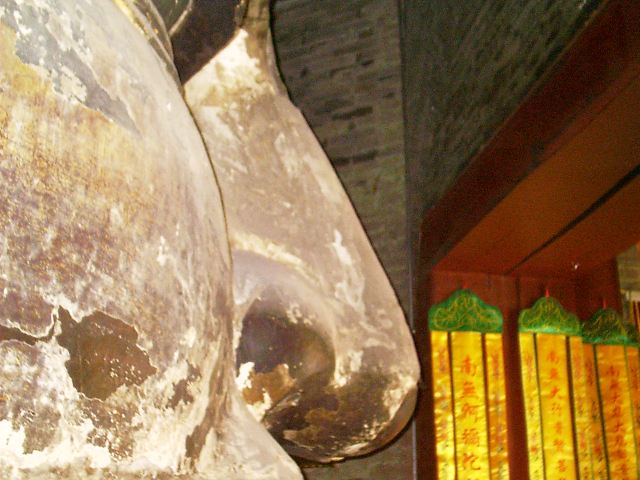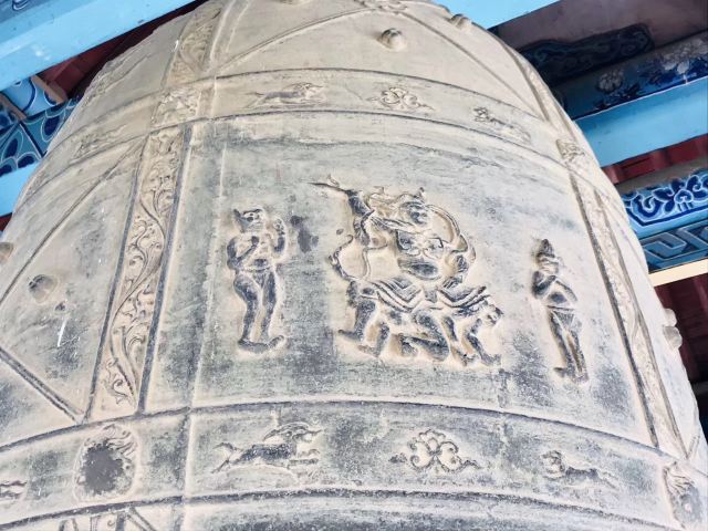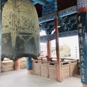 古钟楼上悬有大云铜钟。钟呈黄色,通高226米,口径115米,厚12厘米,重约5吨。钟体上饰有图案3层18格。分上、中、下三部分,每部分又分6格。最上层饰飞天,头戴花冠 ,耳饰明月,上身袒露,下着长裙,彩带缠身,手托果盘,作翩翩飞翔状,线条丰满流畅 ;中层饰天王力士,威武有力,手持武器各异,头戴塔耳帽,身穿盔甲,骑坐夜叉,旁立两 个小鬼,赤身短裤,神态各异,生动传神;最下层饰龙,五彩云纹,现已磨损不全。此钟体积较大,声音洪亮,形状古朴精美,是罕见的古代铸造艺术珍品。从钟体造型和所饰图案分析,为唐代遗物。